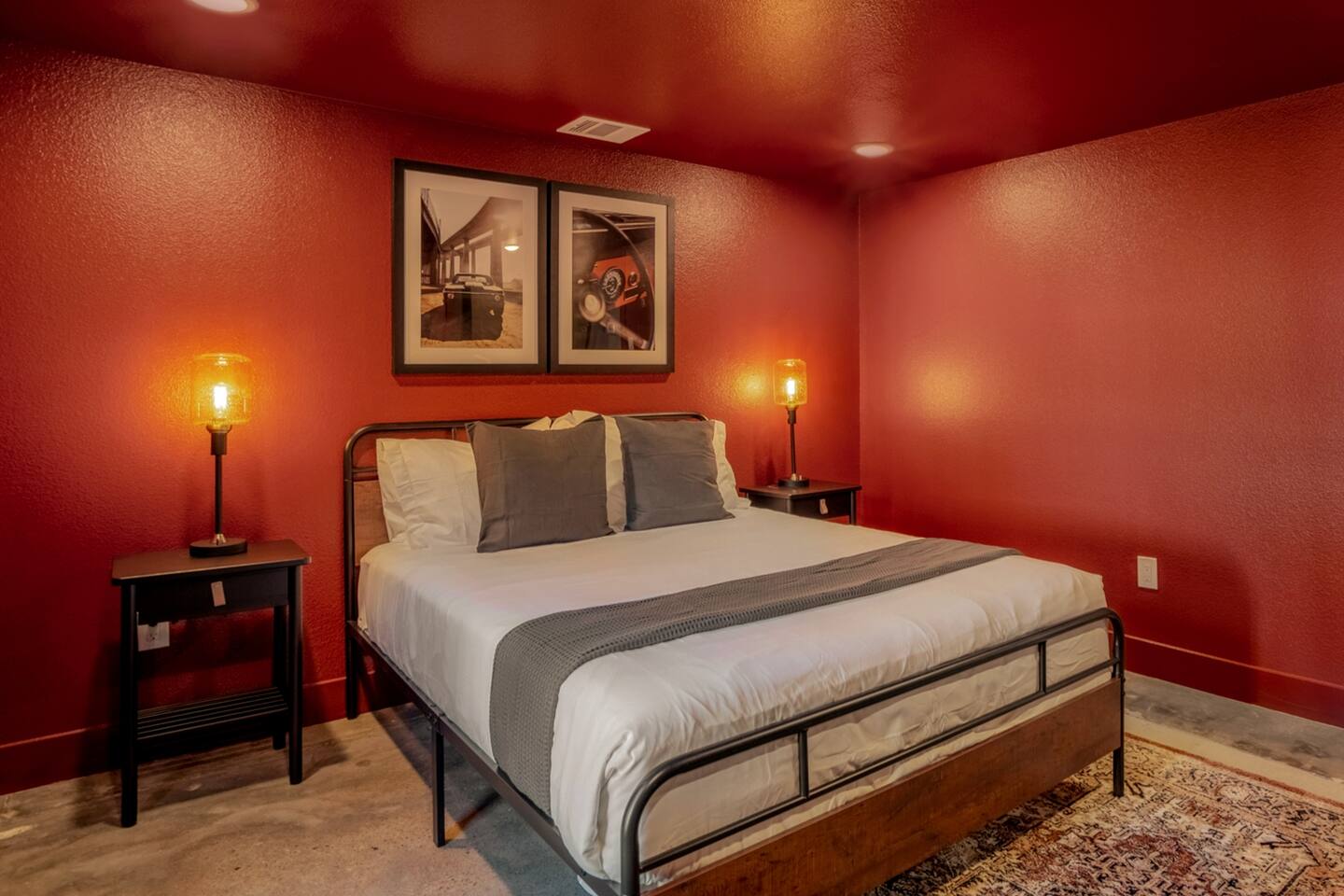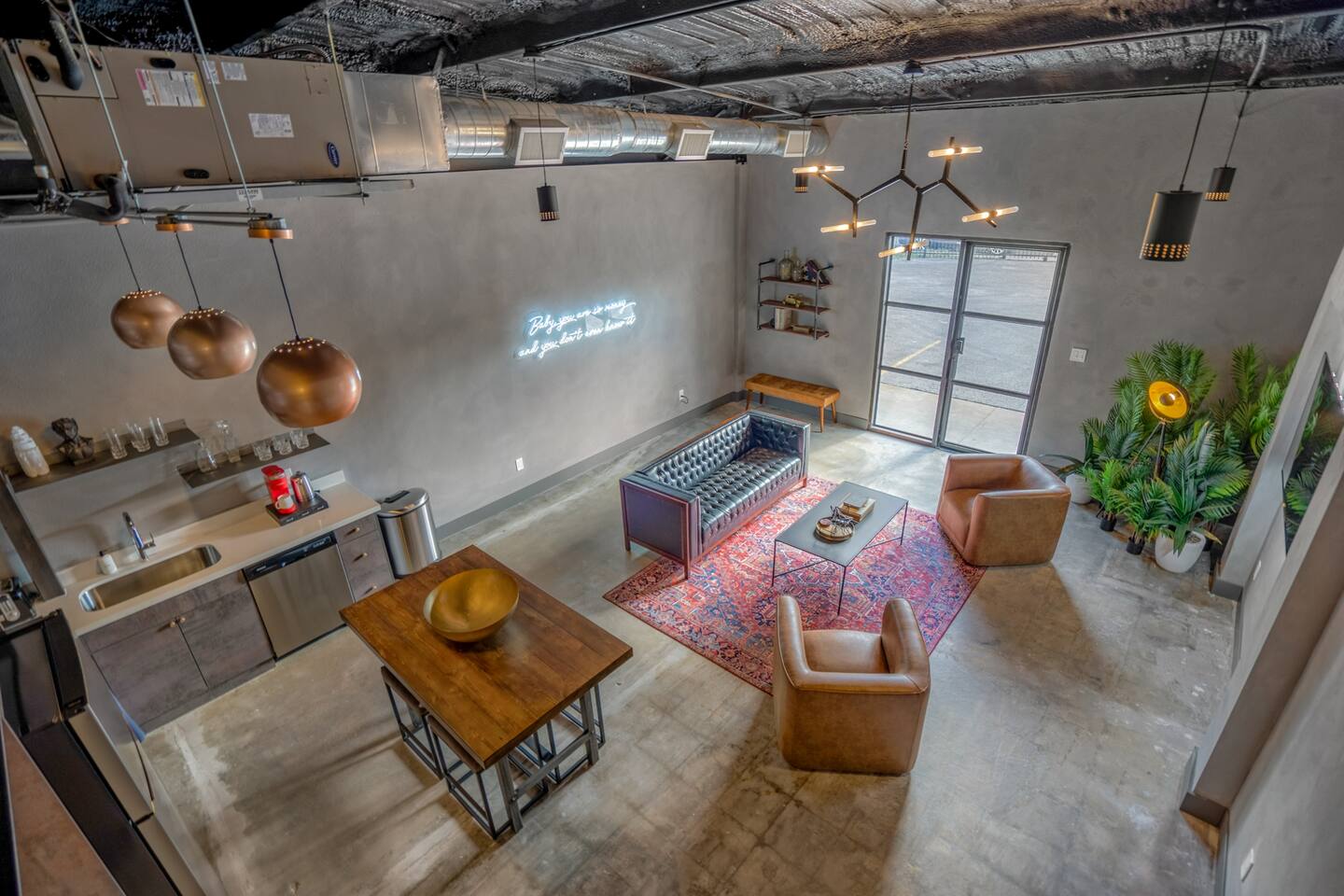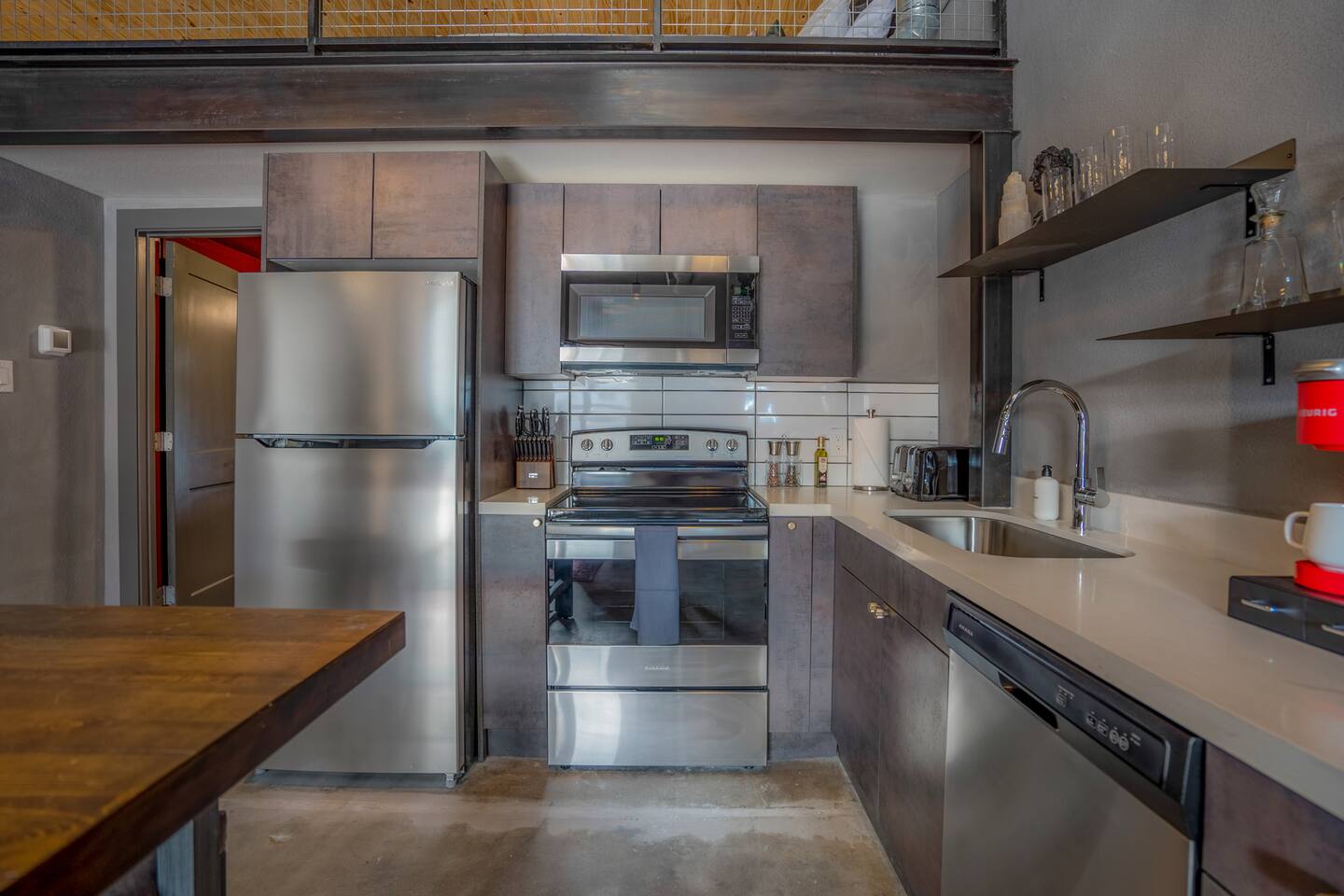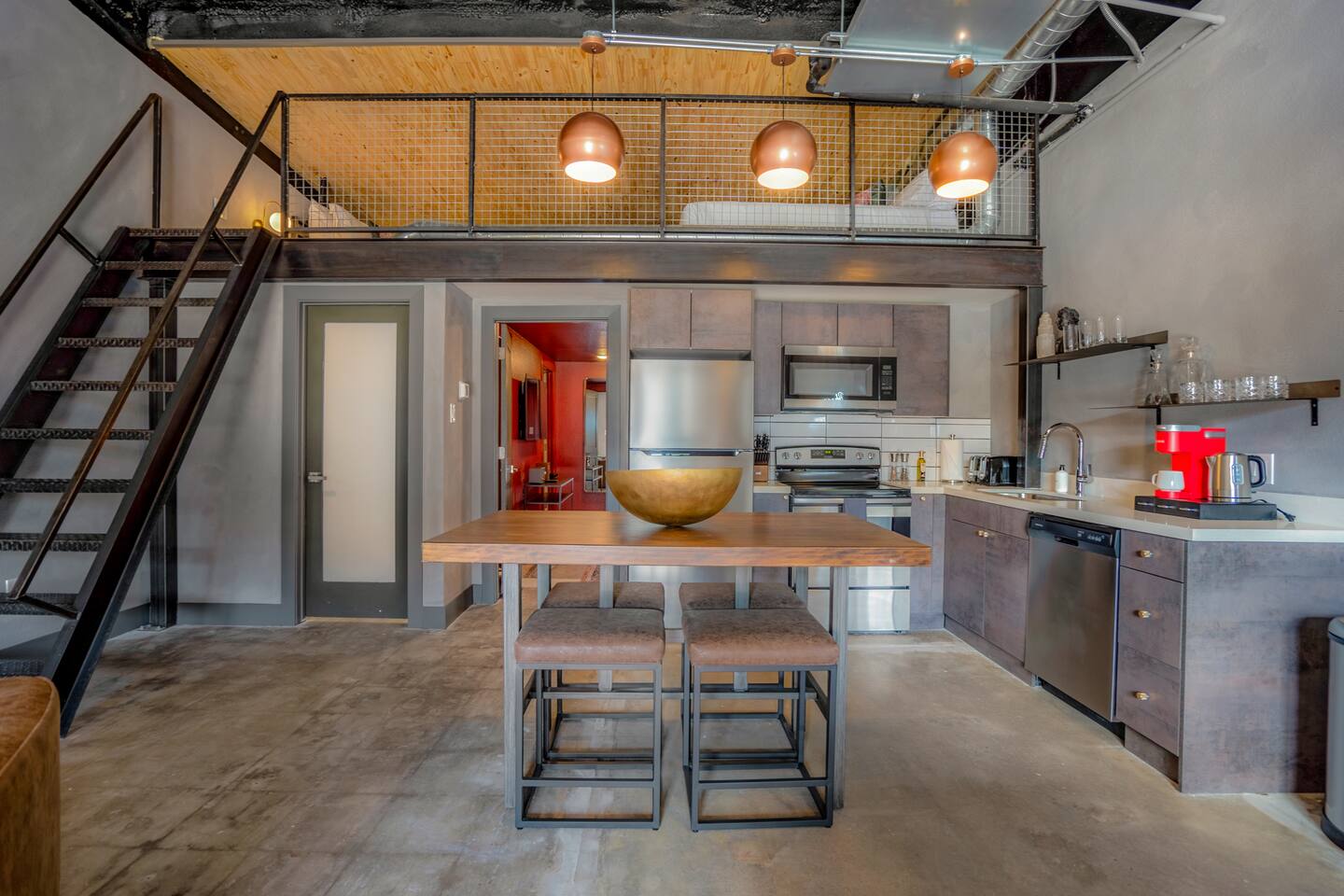 Maltby Motors is a one-of-a-kind historic mechanic shop that has been converted into four uniquely designed industrial loft spaces with their own signature vibe. Located in the heart of Houston's Segundo Barrio which is rich with Latin culture and art. There are a total of four units. Each space is equipped with a kitchen, bathroom, bedroom, living room and upstairs loft that includes two queen-size beds. There are a total of three queen-size beds. Each living room has its own accent wall that would look great in any photoshoot. This is the Americano Loft. The first floor consists of 1 bedroom with a queen bed with a smart TV and walk in shower. Climb up the stairs to find our cozy loft with 2 queen beds! . Our open concept living allows open entertainment from the kitchen to the living room. There is also a shared parking lot and laundry room onsite for our guests to use. This space is ideal for both short and long term stays and we encourage guests to take advantage of the many opportunities for photography. The entire property is gated for privacy and includes a keypad for entry and exit. With its custom design, Maltby Motors would be great for photoshoots, work events, happy hours, and many great activities. Tag us on IG @MaltbyMotors with your favorite moments!