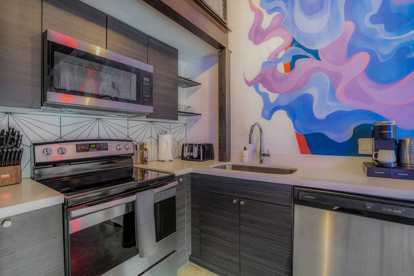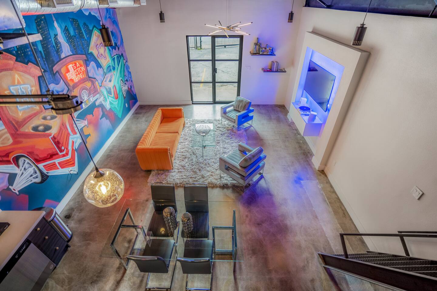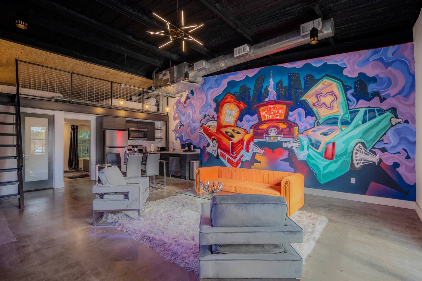 Maltby Motors is a one-of-a-kind historic mechanic shop that has been converted into four uniquely designed industrial loft spaces with their own signature vibe. Located in the heart of Houston's Segundo Barrio which is rich with Latin culture and art. There are a total of four units. Each space is equipped with a kitchen, bathroom, bedroom, living room and upstairs loft that includes two queen-size beds. There are a total of three queen-size beds. Each living room has its own accent wall that would look great in any photoshoot. This is the Slab Loft simply because ITS A HOUSTON THING!. The first floor consists of 1 bedroom with a queen bed with a smart TV and walk in shower. Climb up the stairs to find our cozy loft with 2 queen beds! . Our open concept living allows open entertainment from the kitchen to the living room. There is also a shared parking lot and laundry room onsite for our guests to use. This space is ideal for both short and long term stays and we encourage guests to take advantage of the many opportunities for photography. The entire property is gated for privacy and includes a keypad for entry and exit. With its custom design, Maltby Motors would be great for photoshoots, work events, happy hours, and many great activities. Tag us on IG @MaltbyMotors with your favorite moments!