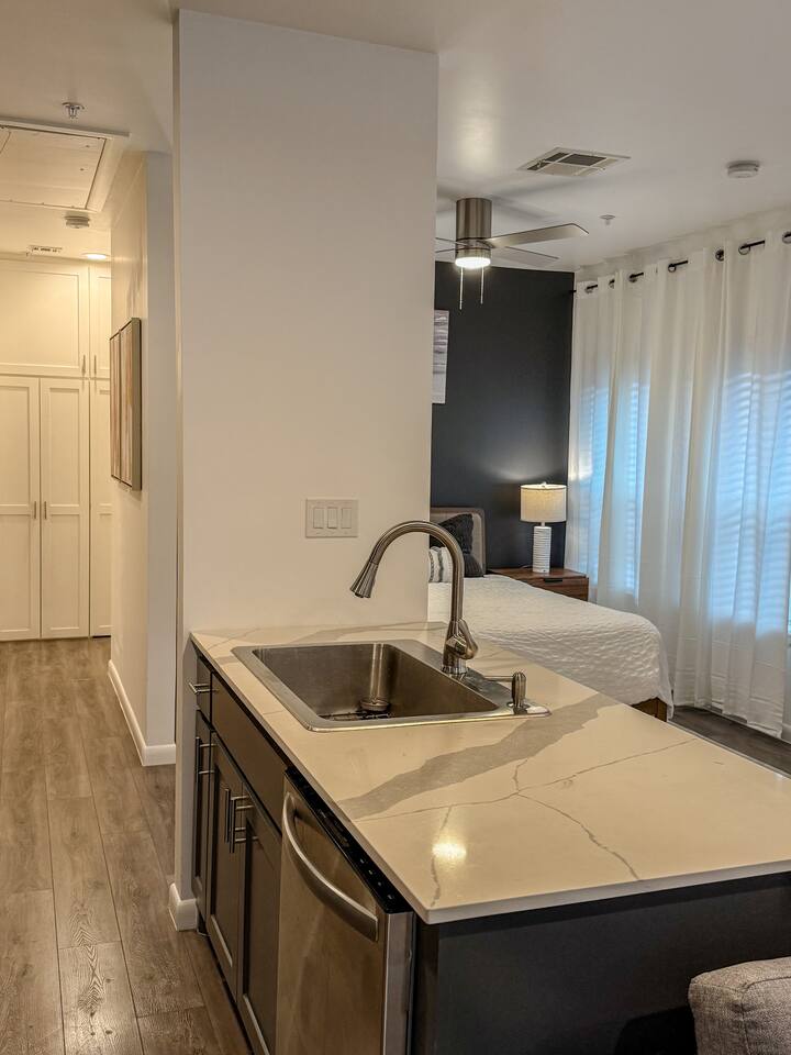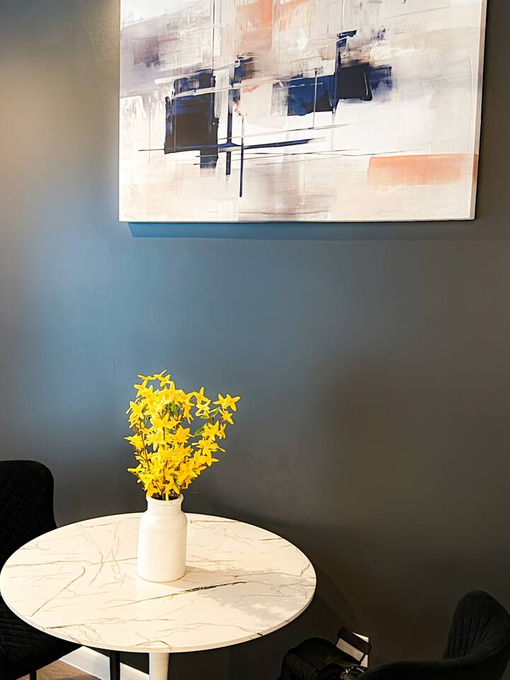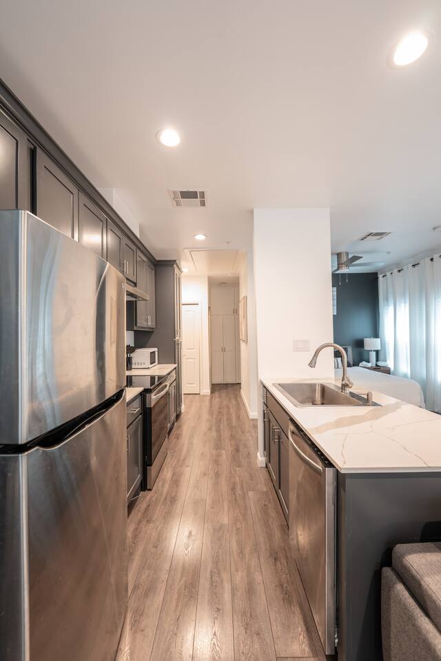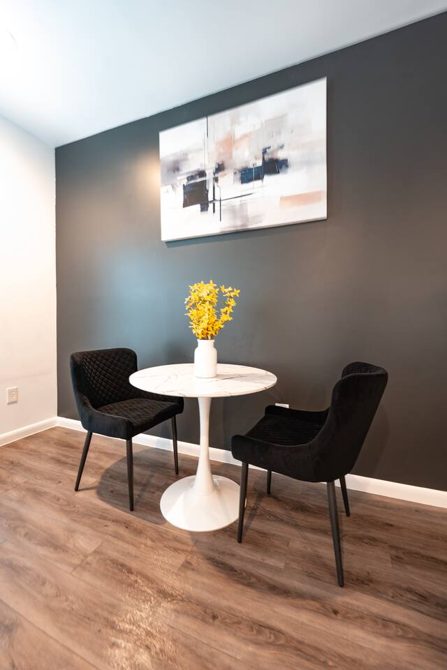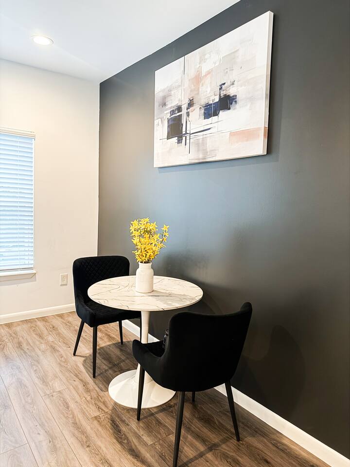 This thoughtfully designed studio offers a welcoming, open-concept layout that blends comfort and style. The cozy living area is perfect for relaxing, while the dining space comfortably seats two. The modern kitchen is fully equipped for home-cooked meals, and the bedroom features a plush bed for restful nights. The bathroom is clean and well-appointed with all essentials provided. The studio’s bright, airy atmosphere ensures a relaxing stay in Houston.