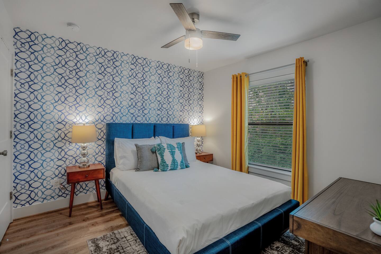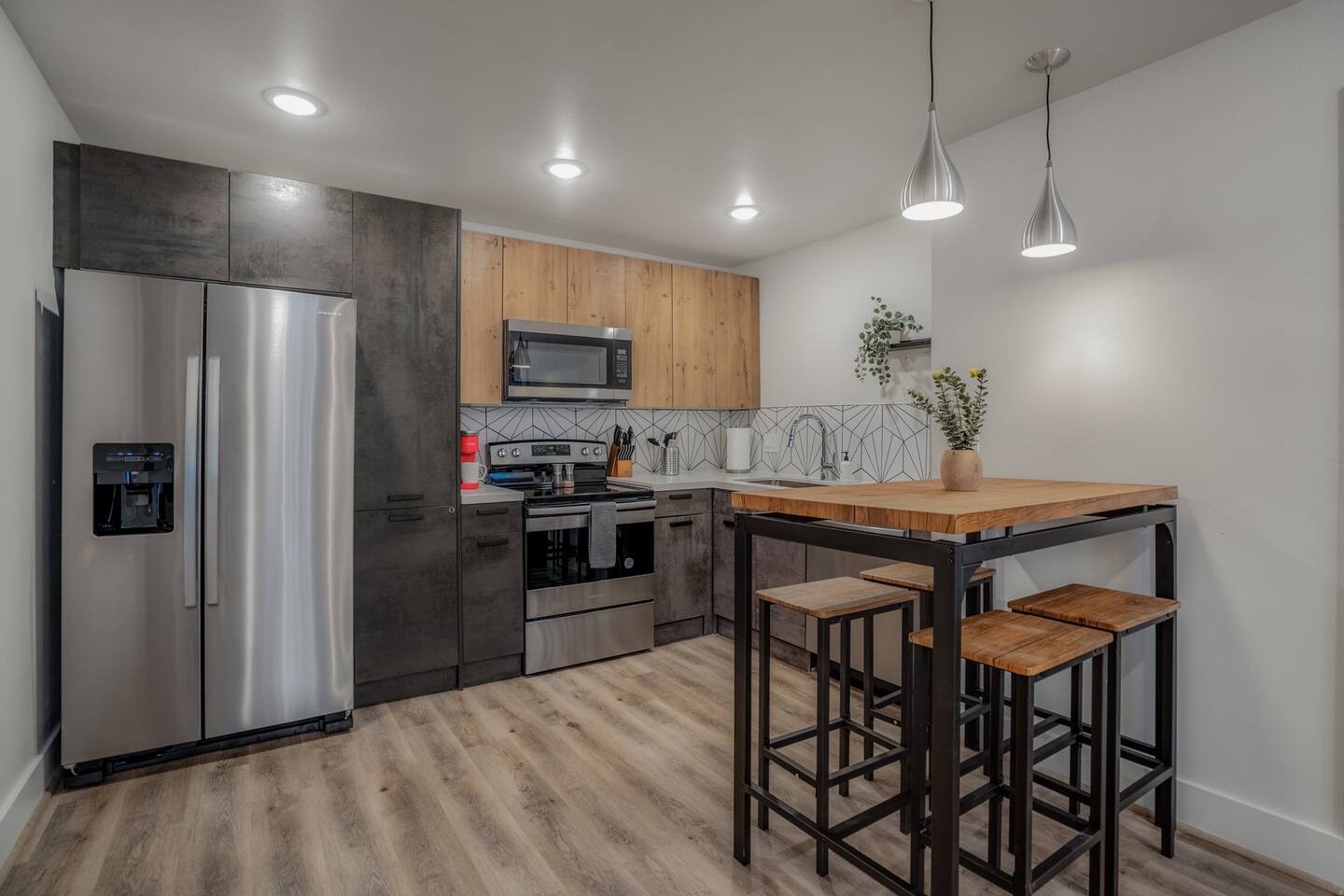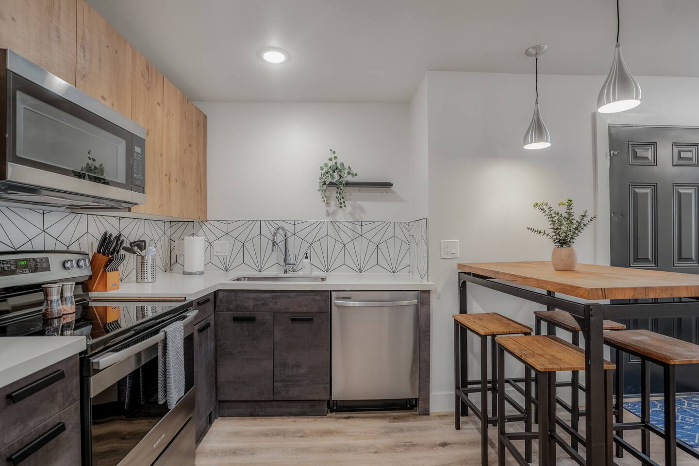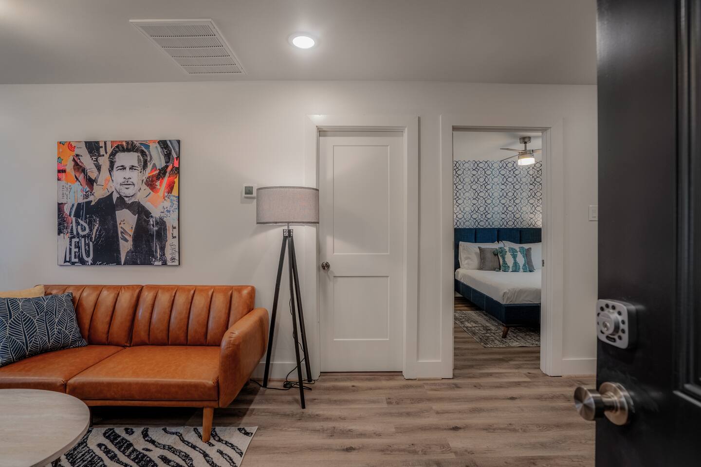This fully renovated Bradley unit on the upper level, includes 2 bedrooms / 1 bath, and offers contemporary artwork, 2 comfortable queen beds, and a full chef’s kitchen. For those who prefer the outdoors, make your way to our plush courtyard for a conversation on our tear drop chairs or restful couches. Free street parking is available all around the property. As a note, this is ONE unit of 15 uniquely designed units at our property. Have more than 4 in your party? We can accommodate up to 60 guests. Our office is onsite and available Monday thru Friday. Ask us about early check ins!
