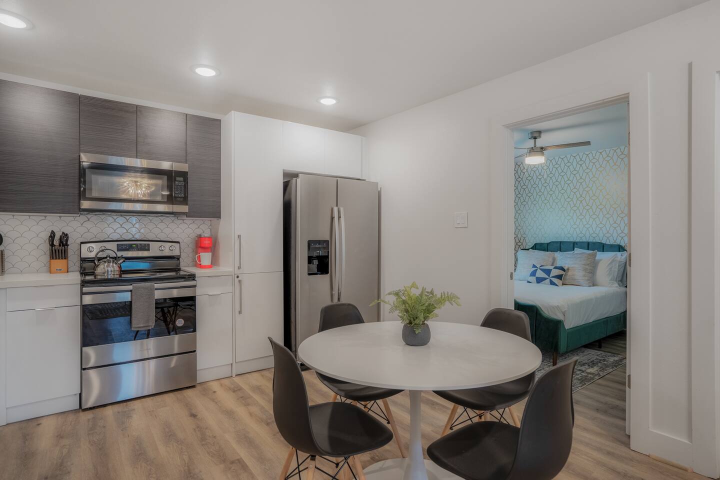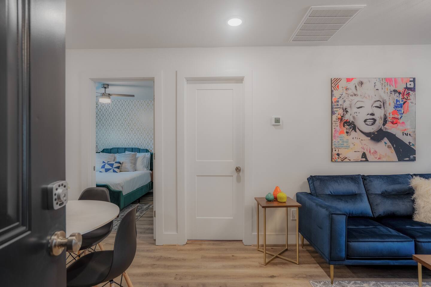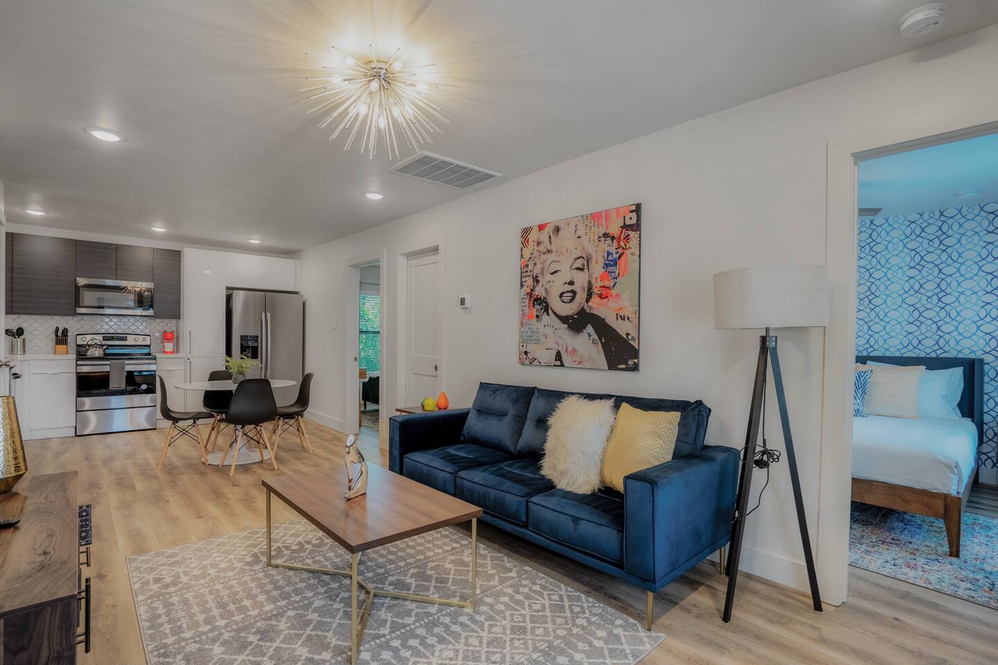 This fully renovated Marilyn unit is on the upper level, includes 2 bedrooms / 2 bath, and offers contemporary artwork, 2 comfortable queen beds, and a full chef’s kitchen. For those who prefer the outdoors, make your way to our plush courtyard for a conversation on our tear drop chairs or restful couches. Free street parking is available all around the property. As a note, this is ONE unit of 15 uniquely designed units at our property. Have more than 4 in your party? We can accommodate up to 60 guests. Our office is onsite and available Monday thru Friday. Ask us about early check ins!