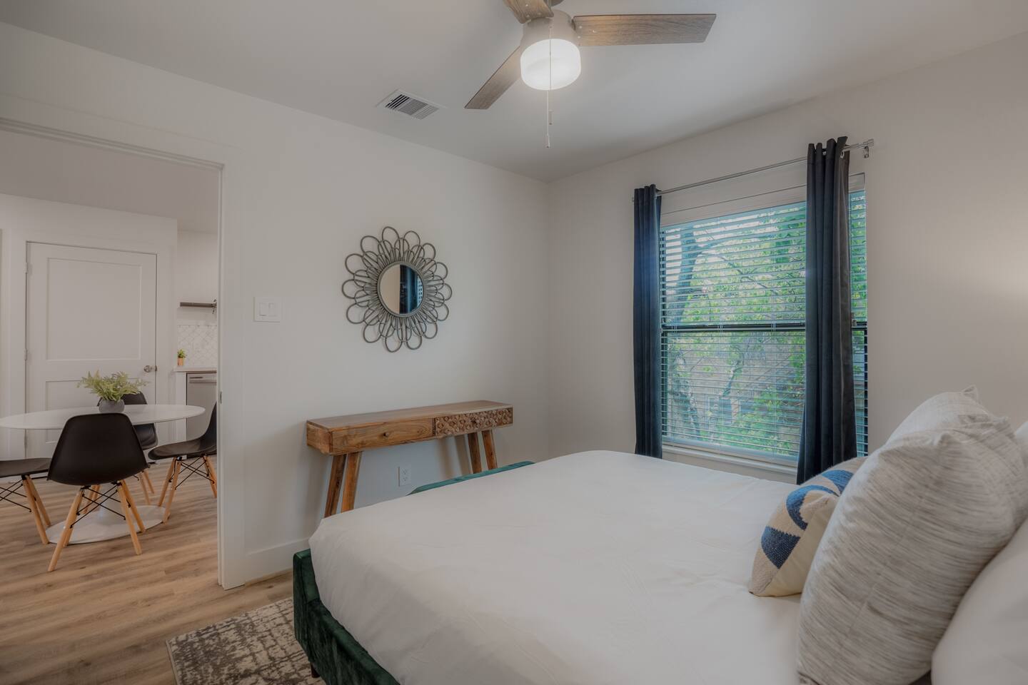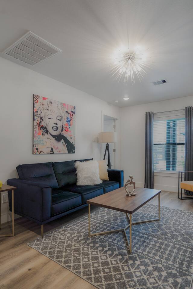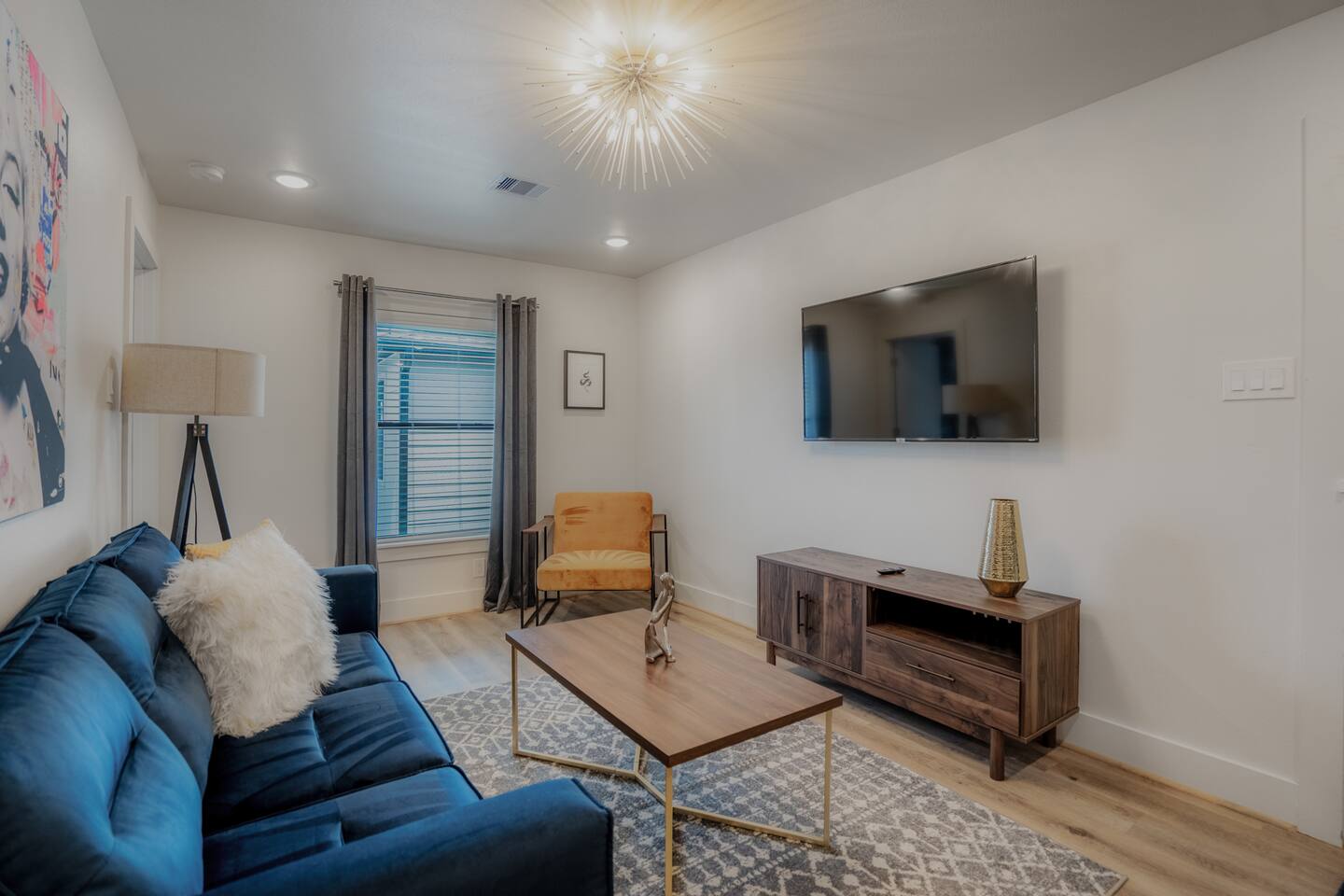 Welcome to The Barbee! Perfect for couples or small groups, this 2-bed/2-bath unit a contemporary living space with stunning artwork and a chef’s kitchen. Relax in our cozy courtyard with tear-drop chairs and couches, or explore the 16 modern-inspired boutique units, accommodating up to 60 guests. Located minutes from the TX Medical Center, stadiums, restaurants, and the Museum District. Enjoy peace of mind with 24/7 outdoor video surveillance, ensuring your safety and comfort during your stay.