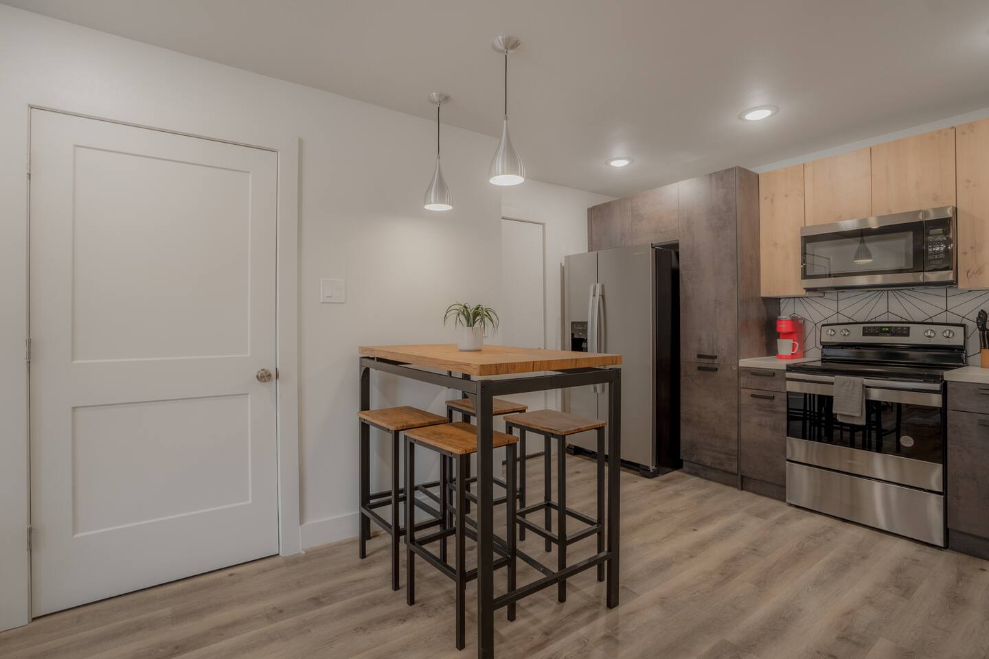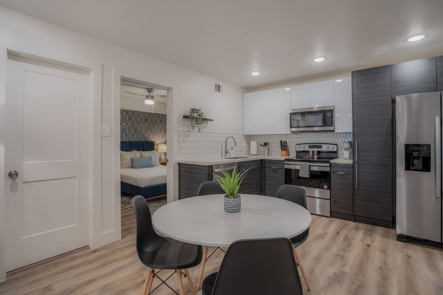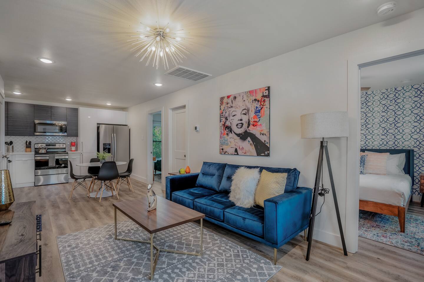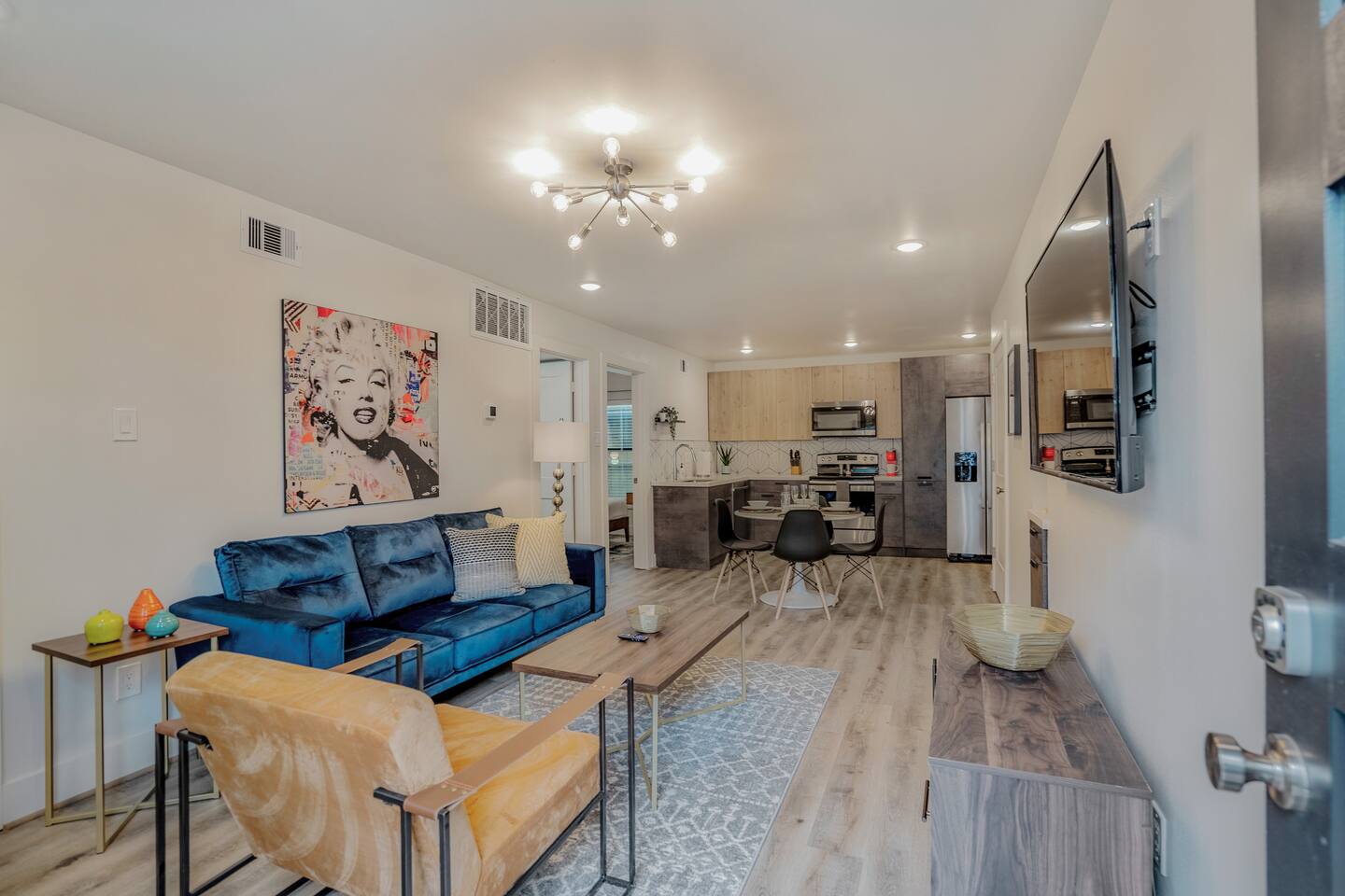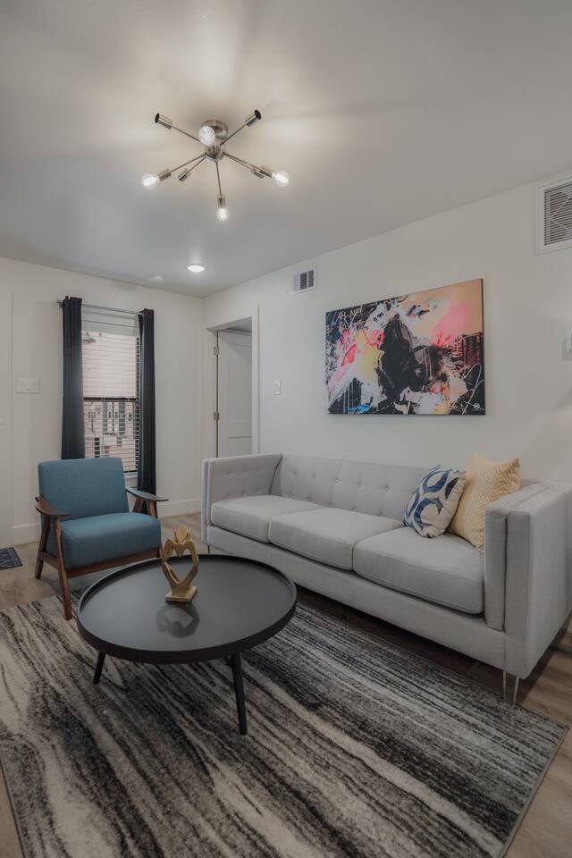 This fully renovated two-story building includes 4 separate apartment units with two units on the first floor and two on the second. Each unit has two bedrooms and either one or two bathrooms. In total, the building includes 4 apartments with 8 bedrooms and 5 baths. Guests can choose from 1 of 8 comfortable queen beds, 4 full chef’s kitchen, 4 open living rooms and even open up the dividing door between the units on the first floor to create one big suite. This is perfect for families and couples! For those who prefer the outdoors, make your way to our plush courtyard for a conversation on our tear drop chairs or restful couches. Free street parking is available all around the property. As a note, this is an entire building that contains 4 units. To put in perspective, The Barbee is comprised of 15 uniquely designed apartment units. Have more than 16 in your party? We can accommodate up to 60 guests. Our office is onsite and available Monday thru Friday. Ask us about early check-in!