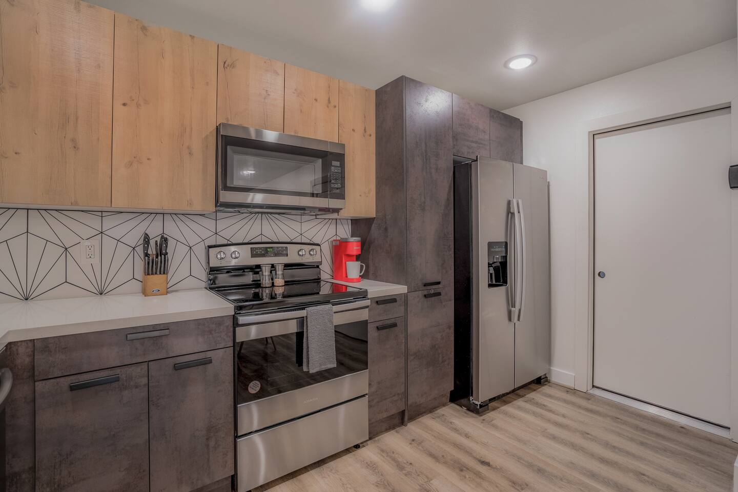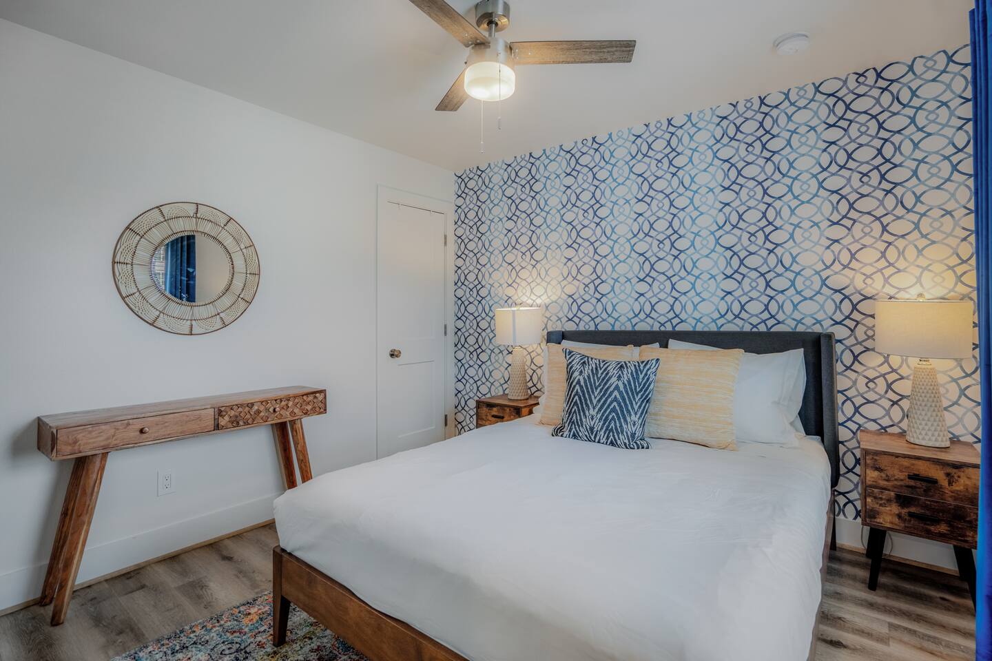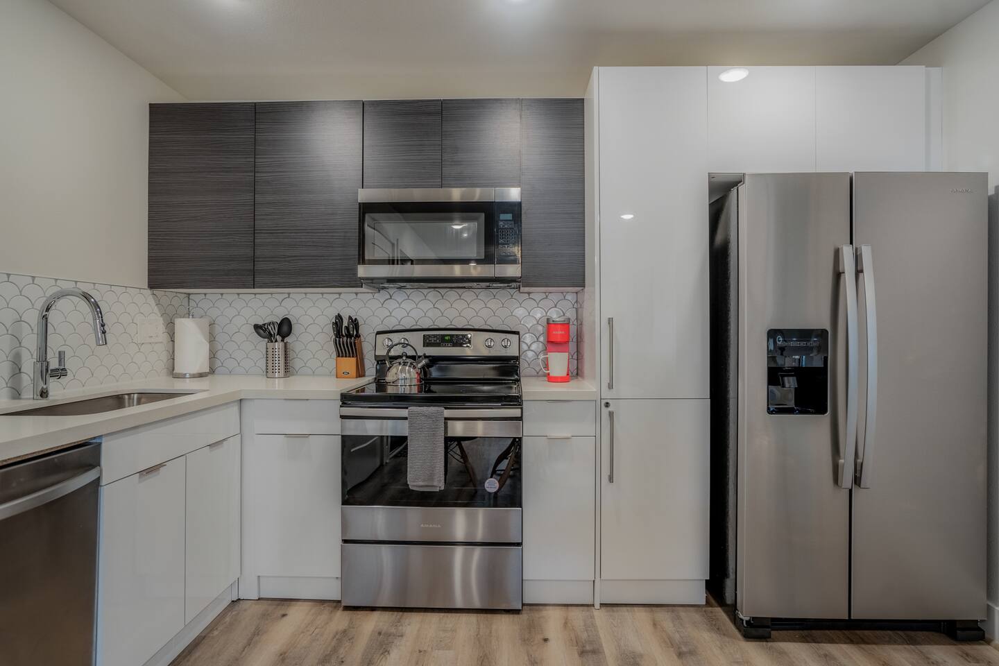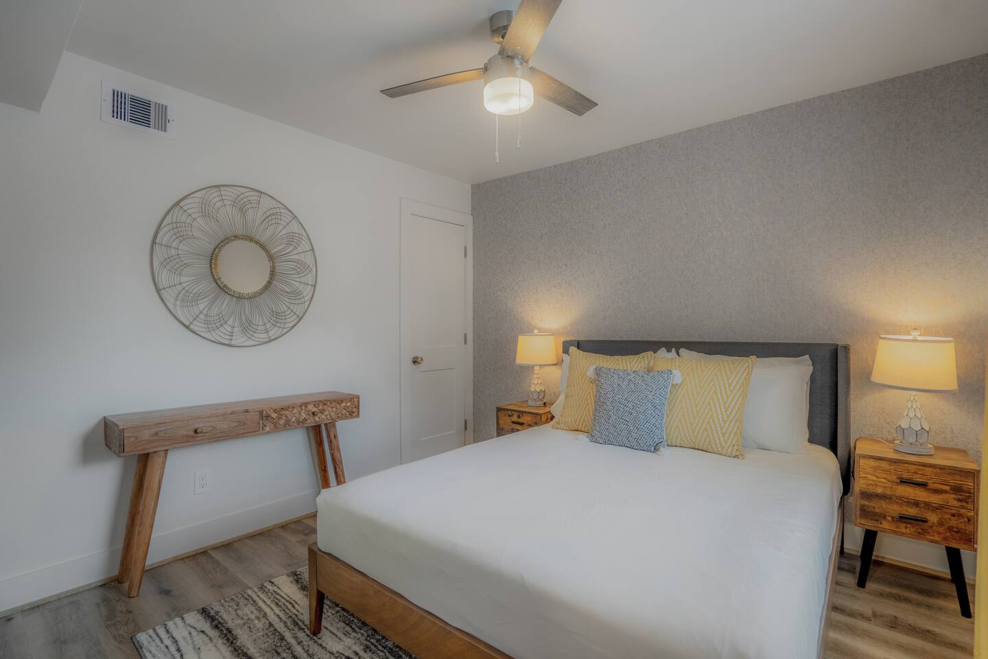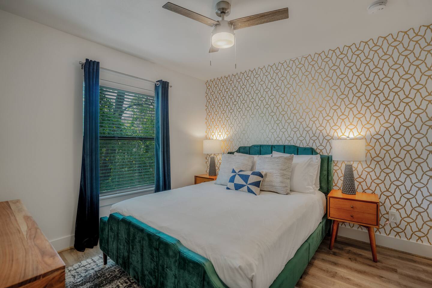 This fully renovated two-story building includes 4 separate apartment units with two units on the first floor and two on the second. Each unit has two bedrooms and either one or two bathrooms. In total, the building includes 4 apartments with 8 bedrooms and 5 baths. Guests can choose from 1 of 8 comfortable queen beds, 4 full chef’s kitchen, 4 open living rooms and even open up the dividing door between the units on the first floor to create one big suite. This is perfect for families and couples! For those who prefer the outdoors, make your way to our plush courtyard for a conversation on our tear drop chairs or restful couches. Free street parking is available all around the property. As a note, this is an entire building that contains 4 units. To put in perspective, The Barbee is comprised of 15 uniquely designed apartment units. Have more than 16 in your party? We can accommodate up to 60 guests. Our office is onsite and available Monday thru Friday. Ask us about early check-in!