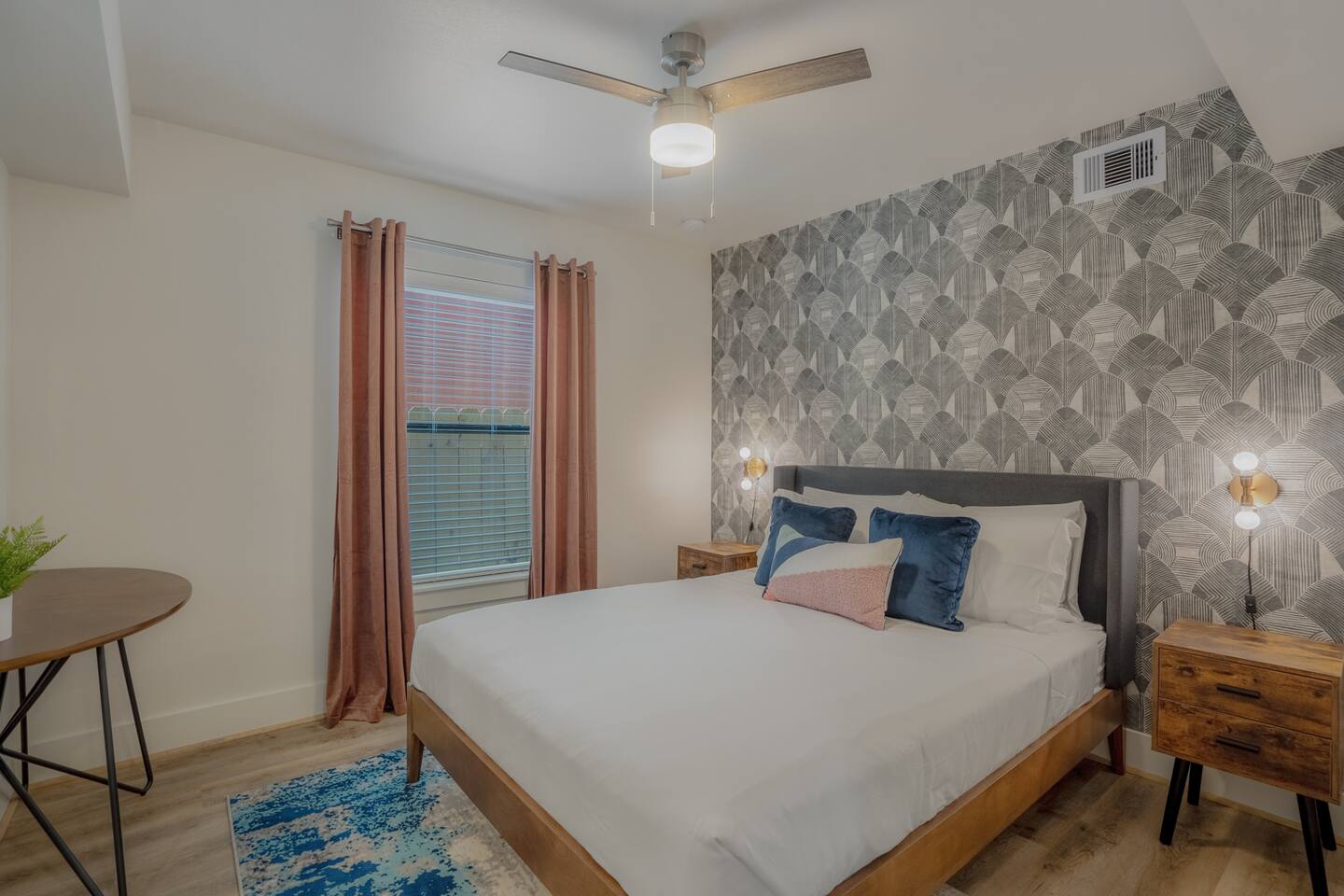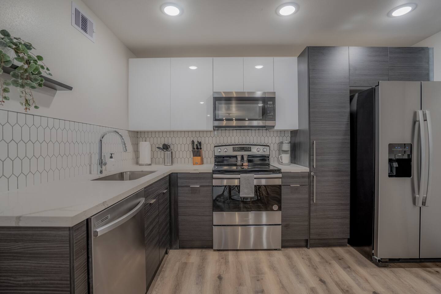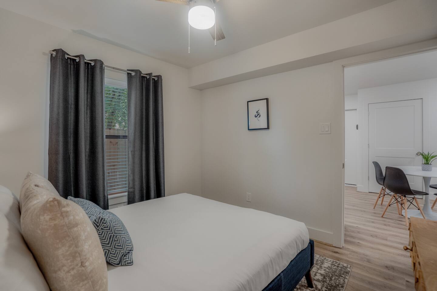 This fully renovated Dean unit rests on the lower level, includes 2 bedrooms / 2 bath, and offers contemporary artwork, 2 comfortable queen beds, and a full chef’s kitchen. For those who prefer the outdoors, make your way to our plush courtyard for a conversation on our tear drop chairs or restful couches. Free street parking is available all around the property. As a note, this is ONE unit of 15 uniquely designed units at our property. Have more than 4 in your party? We can accommodate up to 60 guests. Our office is onsite and available Monday thru Friday. Ask us about early check ins!