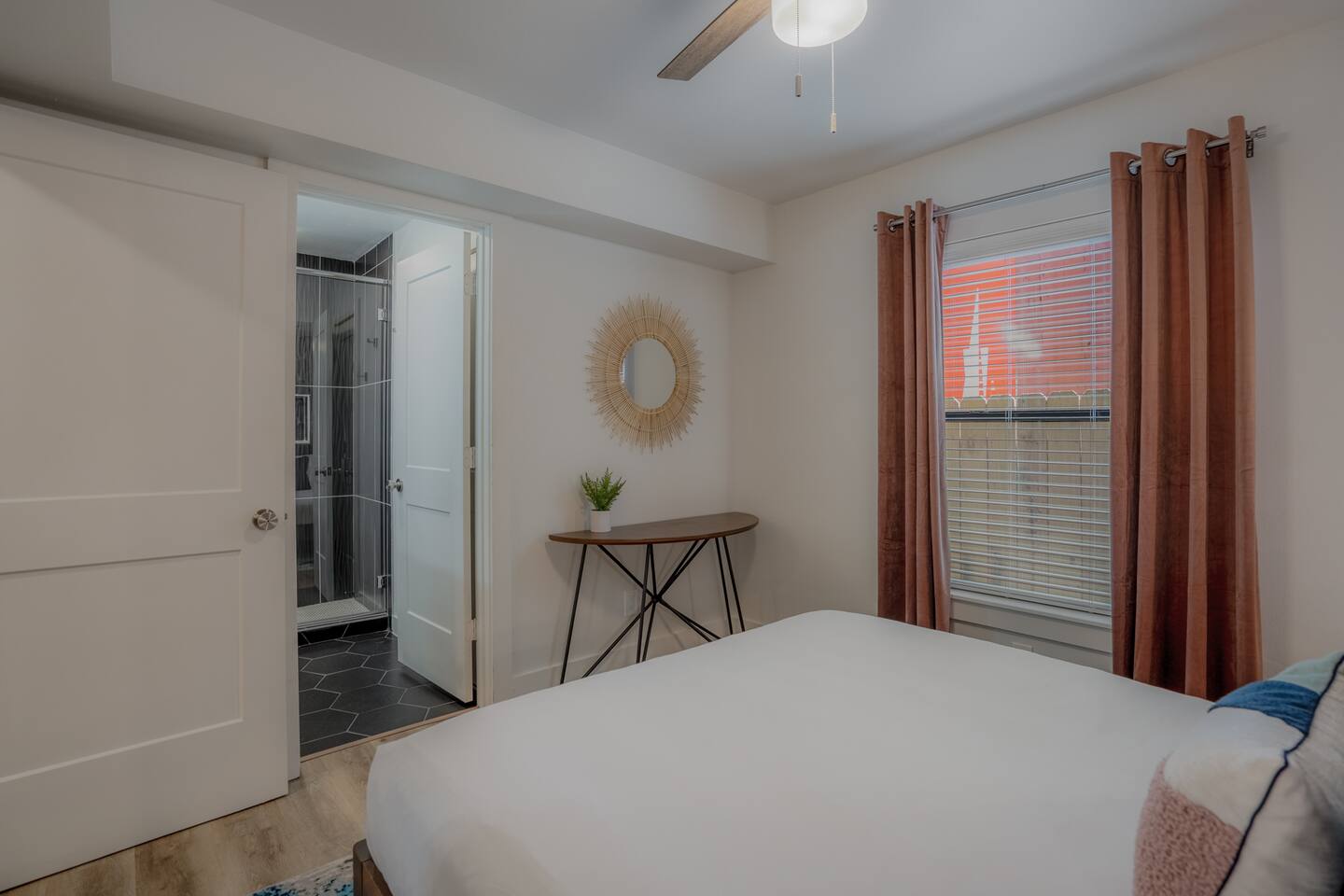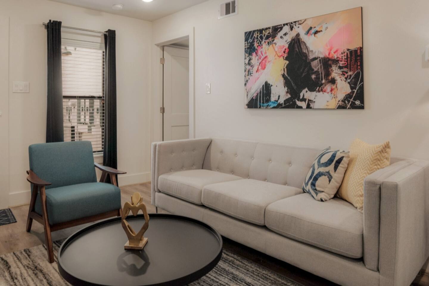 Welcome to The Barbee! Perfect for couples or small groups, this 2-bed/2-bath unit a contemporary living space with stunning artwork and a chef’s kitchen. Relax in our cozy courtyard with tear-drop chairs and couches, or explore the 16 modern-inspired boutique units, accommodating up to 60 guests. Located minutes from the TX Medical Center, stadiums, restaurants, and the Museum District. Enjoy peace of mind with 24/7 outdoor video surveillance, ensuring your safety and comfort during your stay.