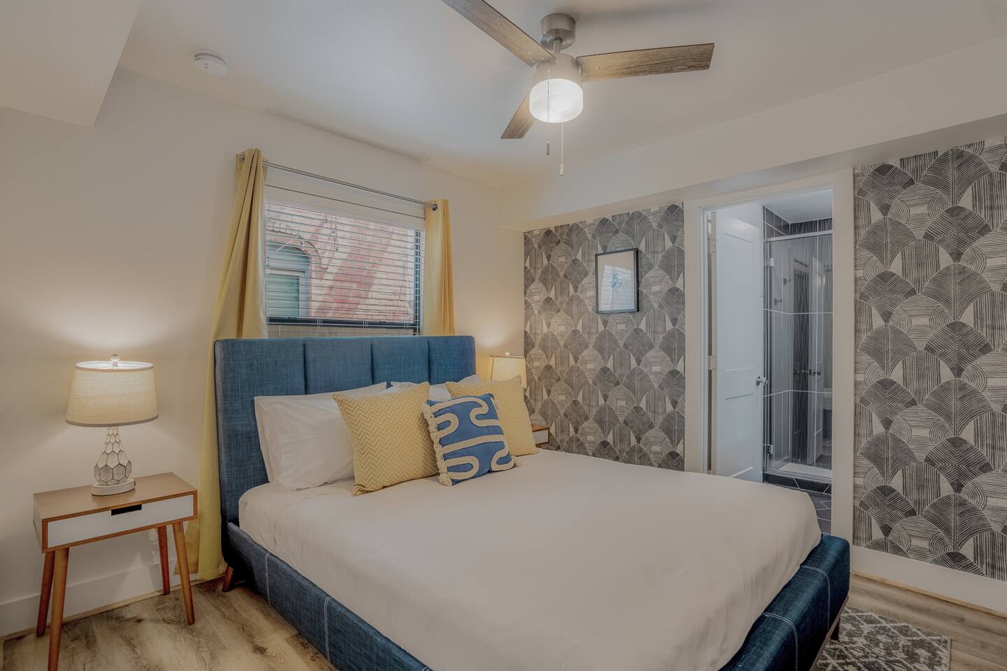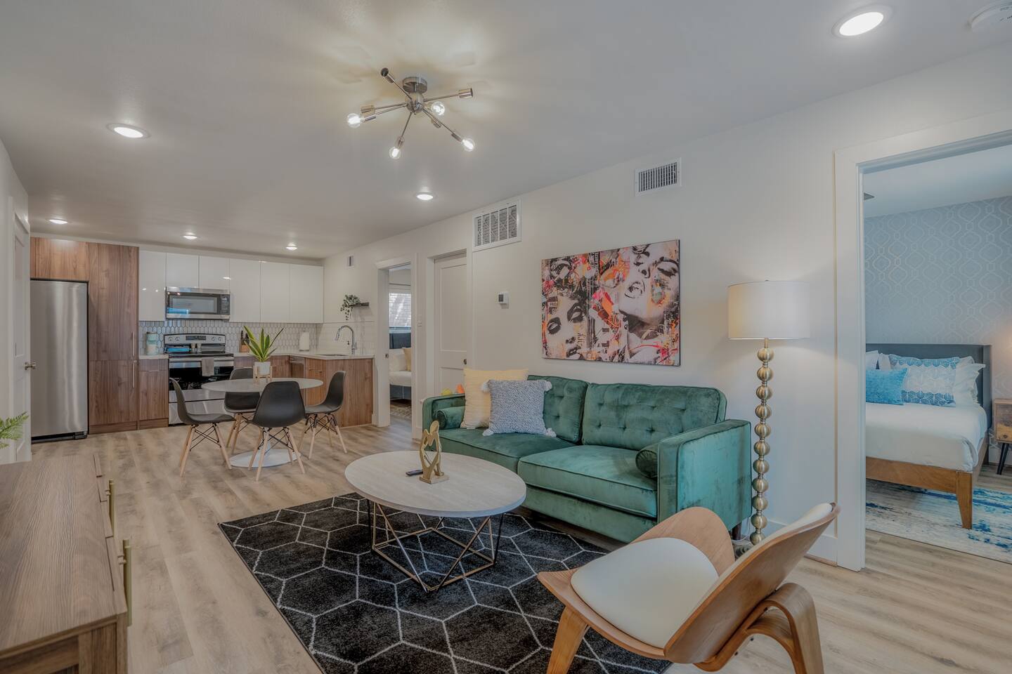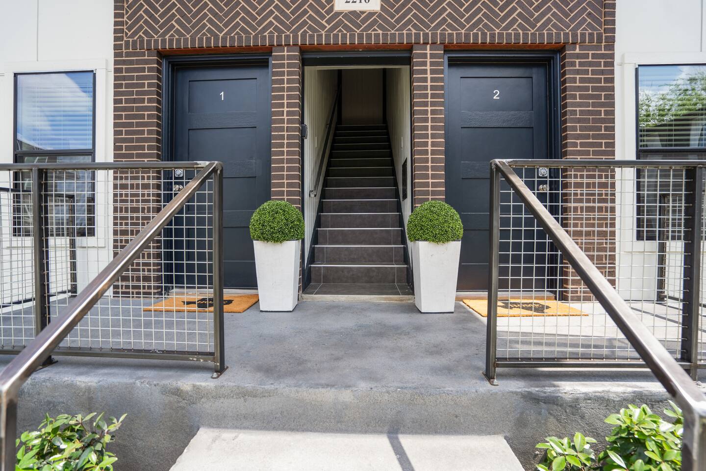 This fully renovated two-story building includes 4 separate units with two apartments on the first floor and two on the second. Each unit has two bedrooms and either one or two bathrooms. In total the building includes 8 bedrooms and 6 baths. Guests can choose from 1 of 8 comfortable queen beds, 4 full chef’s kitchen, 4 open living rooms and even open up the dividing door between the units on the first floor to create one big suite. This is perfect for families and couples! For those who prefer the outdoors, make your way to our plush courtyard for a conversation on our tear drop chairs or restful couches. Free street parking is available all around the property. As a note, this is an entire building that contains 4 units. To put in perspective, The Barbee is comprised of 15 uniquely designed units. Have more than 16 in your party? We can accommodate up to 60 guests. Our office is onsite and available Monday thru Friday. Ask us about early check-in!