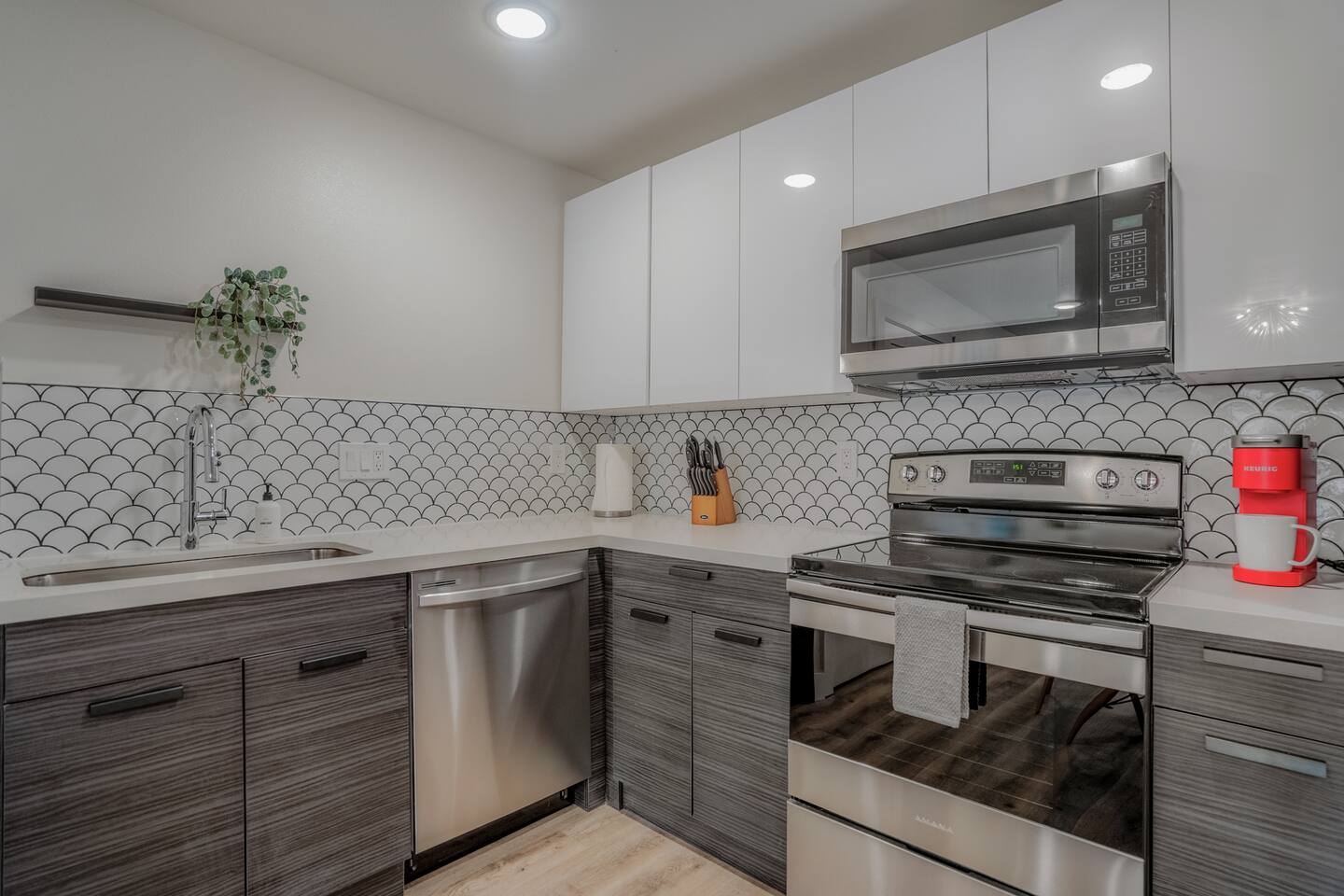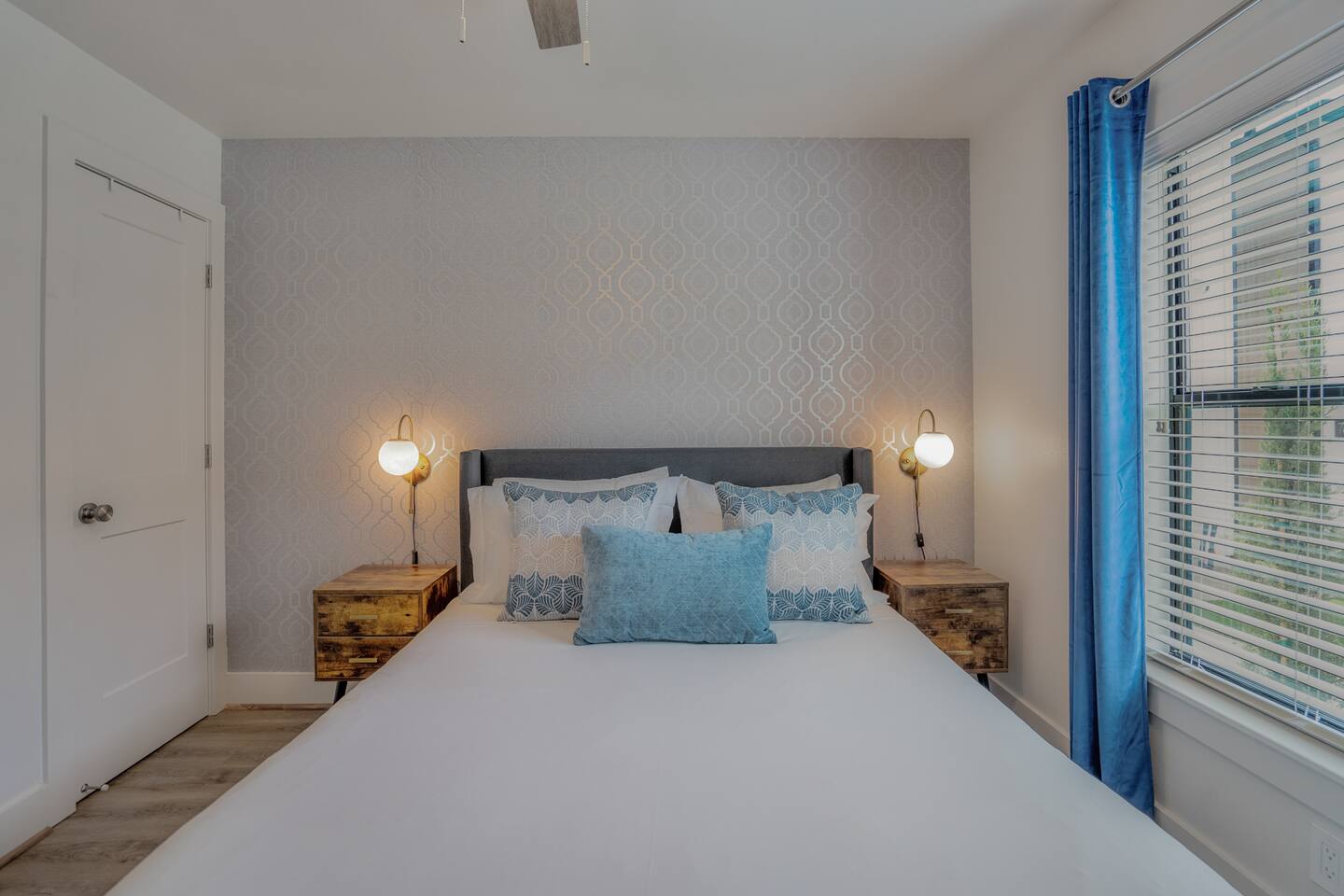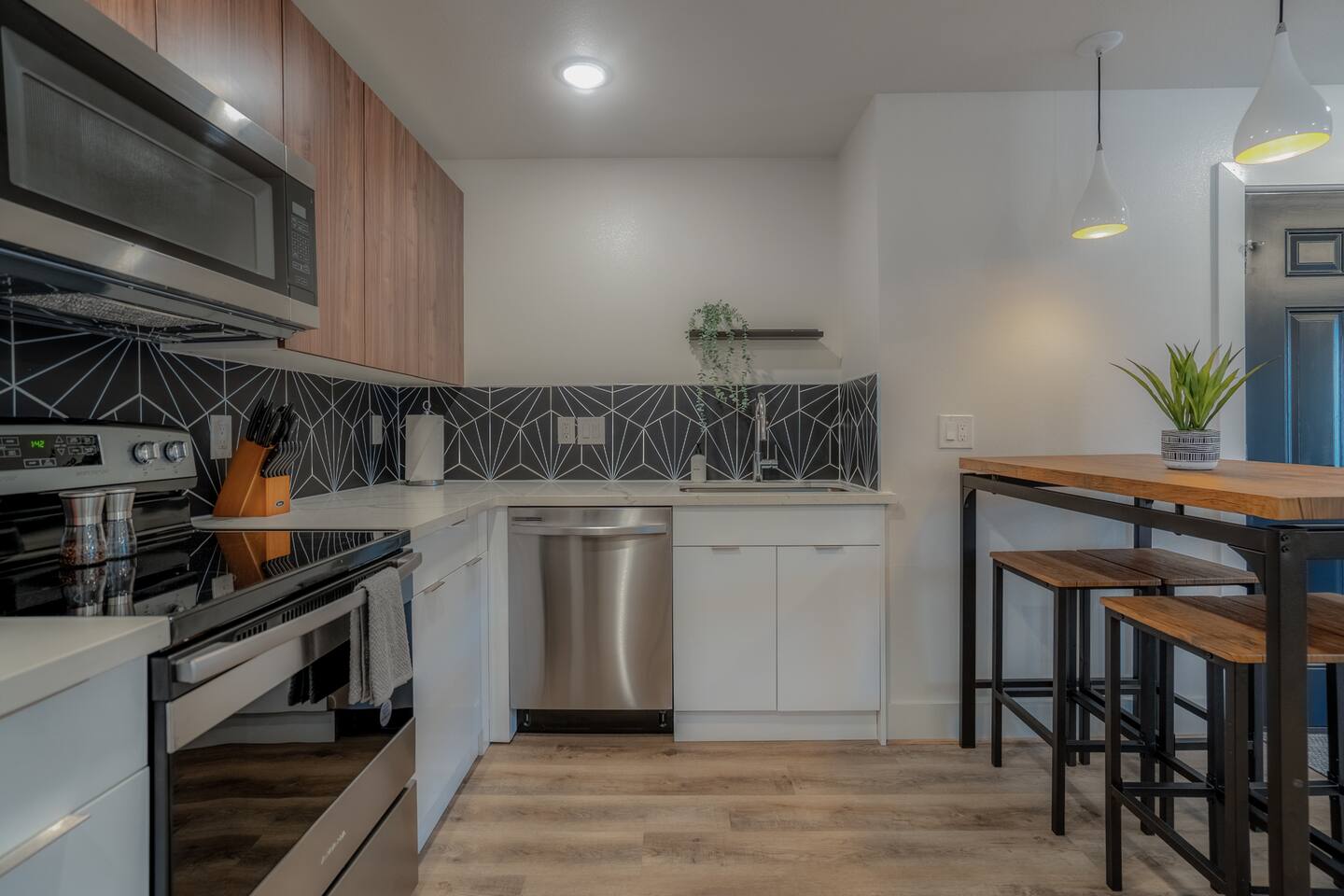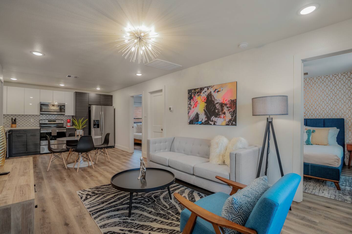 This fully renovated two-story building includes 4 separate units with two apartments on the first floor and two on the second. Each unit has two bedrooms and either one or two bathrooms. In total the building includes 8 bedrooms and 6 baths. Guests can choose from 1 of 8 comfortable queen beds, 4 full chef’s kitchen, 4 open living rooms and even open up the dividing door between the units on the first floor to create one big suite. This is perfect for families and couples! For those who prefer the outdoors, make your way to our plush courtyard for a conversation on our tear drop chairs or restful couches. Free street parking is available all around the property. As a note, this is an entire building that contains 4 units. To put in perspective, The Barbee is comprised of 15 uniquely designed units. Have more than 16 in your party? We can accommodate up to 60 guests. Our office is onsite and available Monday thru Friday. Ask us about early check-in!