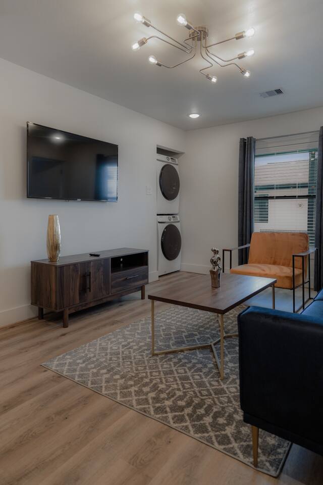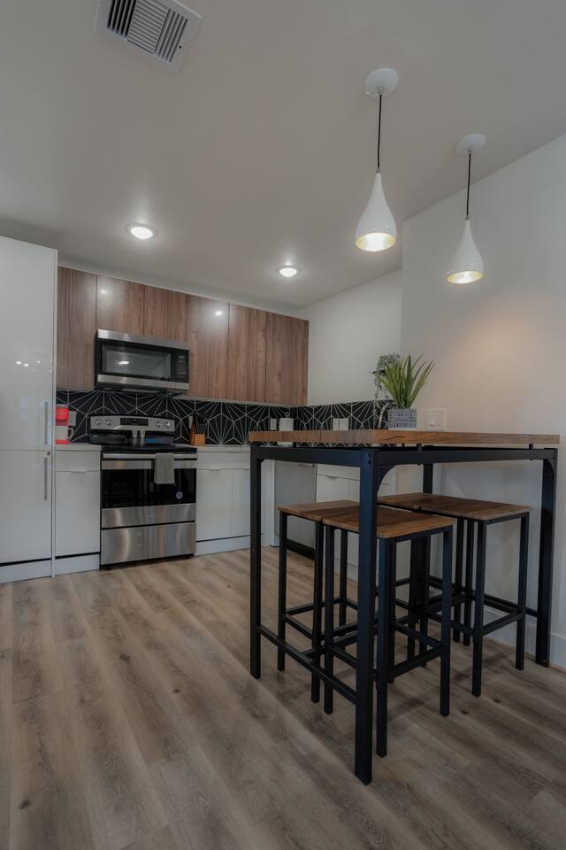 Welcome to The Barbee! Perfect for couples or gathering of friends, this 2 bed/1 bath unit is on the upper level with contemporary artwork and a full chef’s kitchen. Relax in our plush courtyard for a conversation on our tear drop chairs or couches. The entire property features 15 modern-inspired boutique units and can sleep up to 60 guests. Minutes from TX Medical Center, stadiums, restaurants, and the Museum District. 24/7 outdoor video surveillance to feel 100% safe.