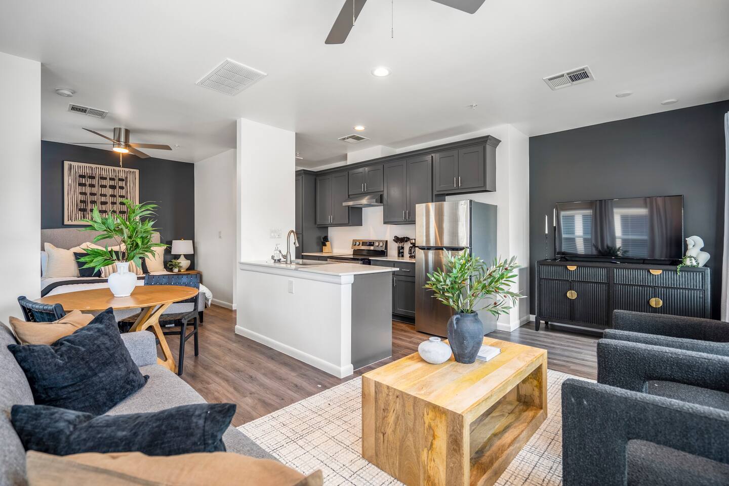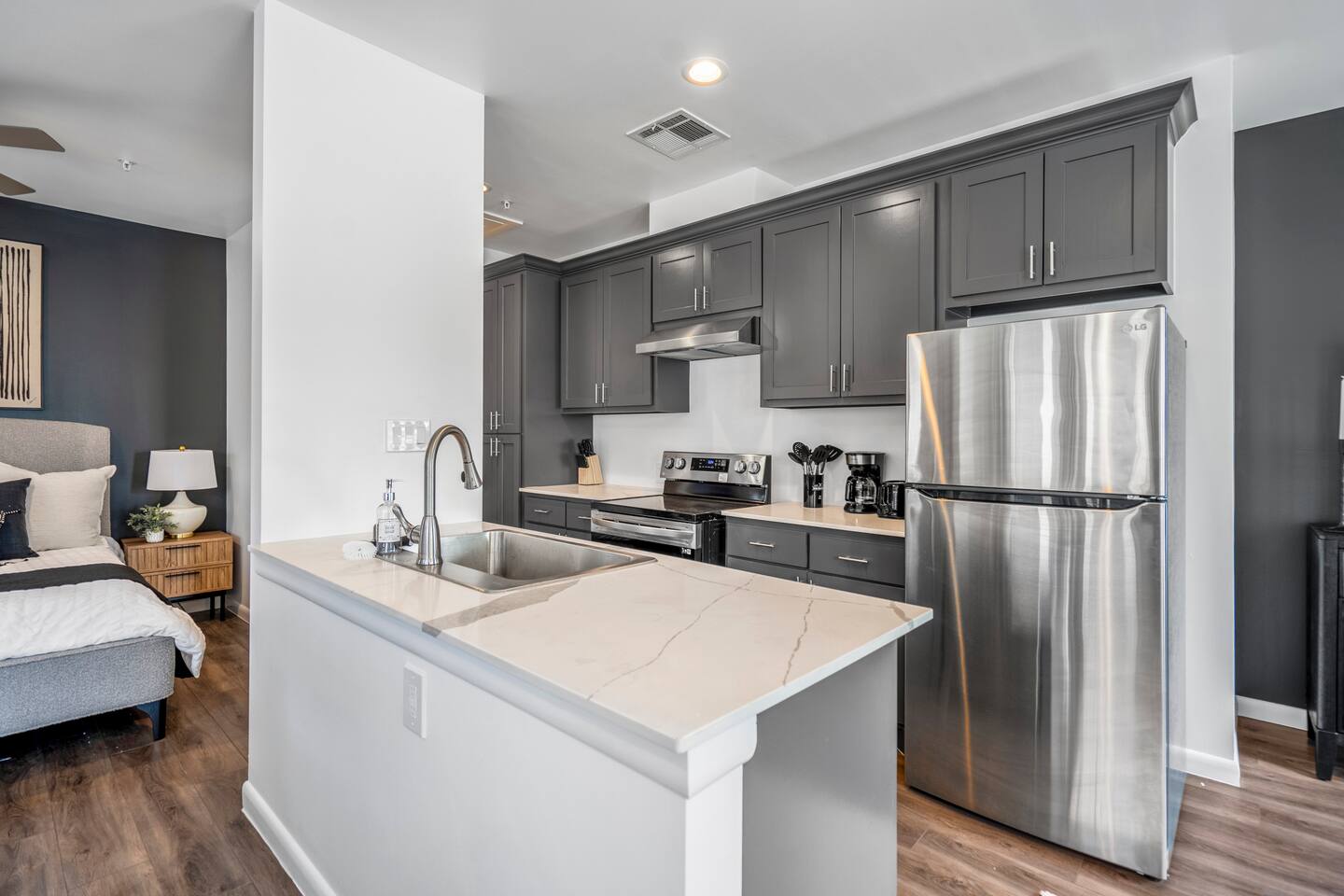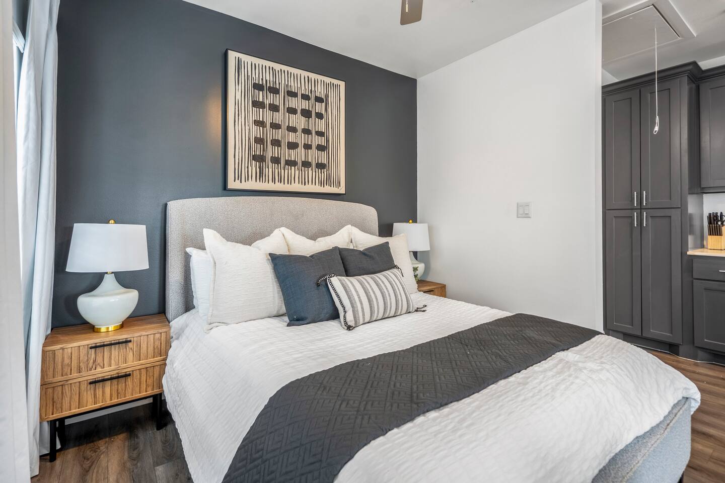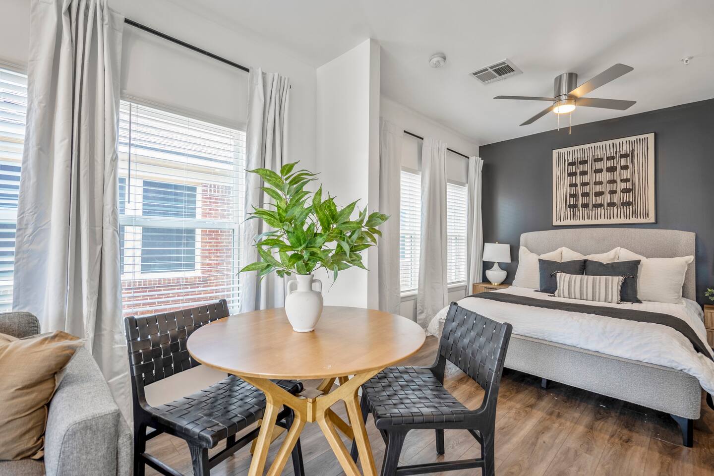 This thoughtfully designed studio offers a welcoming, open-concept layout that blends comfort and style. The cozy living area is perfect for relaxing, while the dining space comfortably seats two. The modern kitchen is fully equipped for home-cooked meals, and the bedroom features a plush bed for restful nights. The bathroom is clean and well-appointed with all essentials provided. The studio’s bright, airy atmosphere ensures a relaxing stay in Houston.