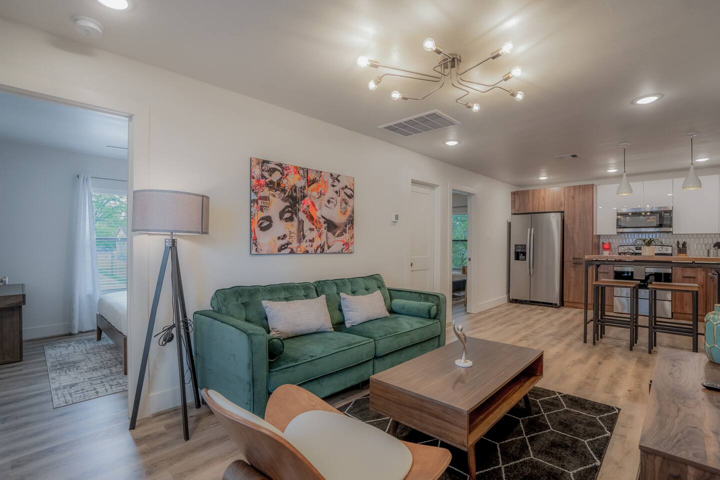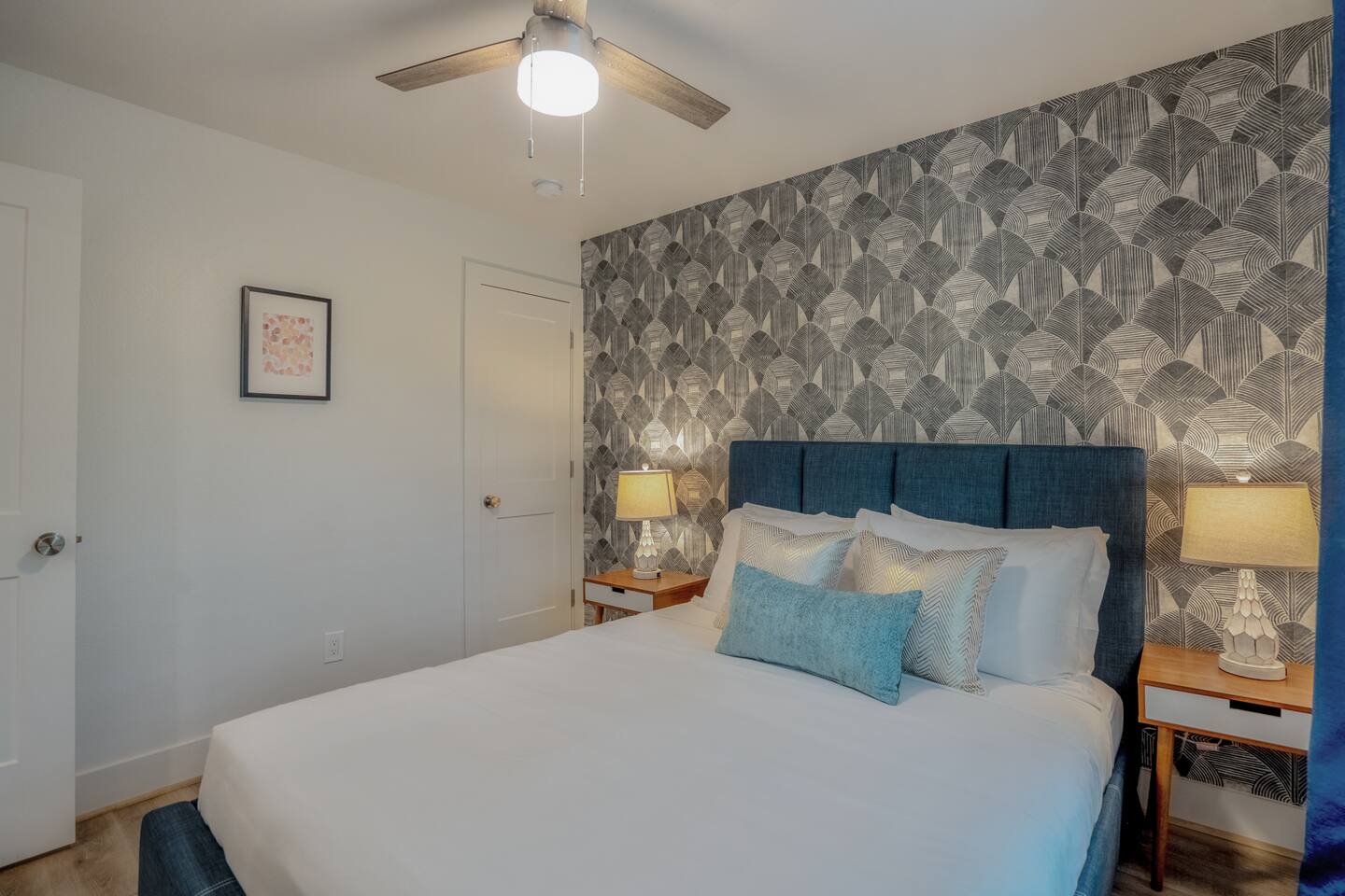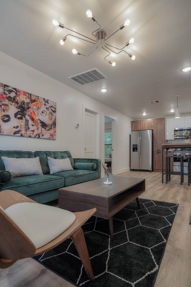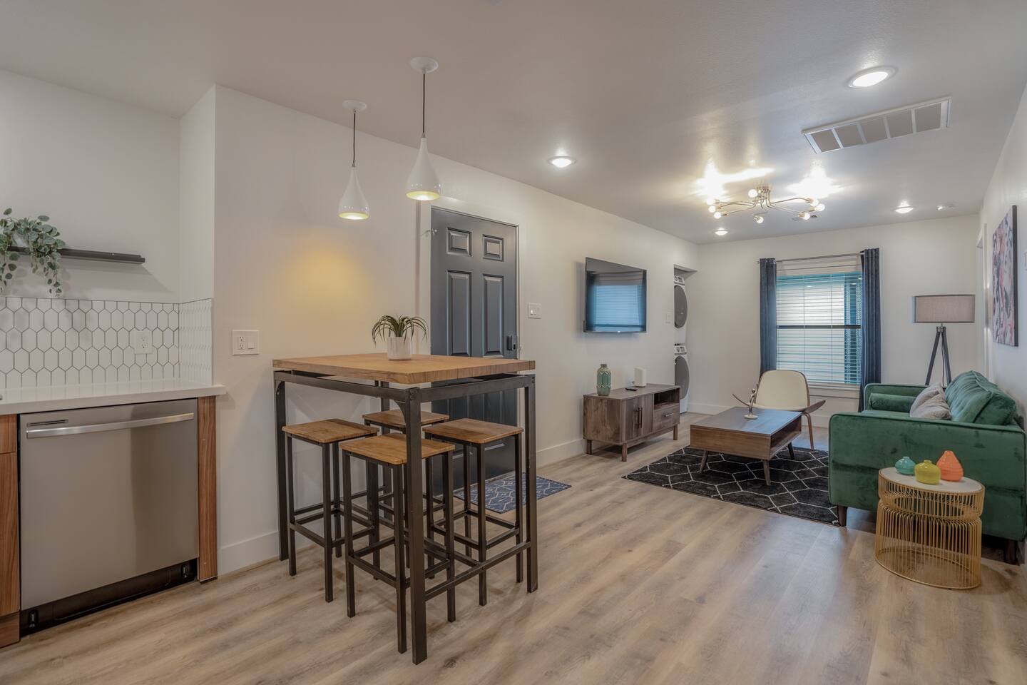 This fully renovated Ephemeral unit is located on the upper level and features 2 bedrooms and 2 bathrooms, contemporary artwork, two comfortable queen beds, and a fully equipped kitchen. You can also relax in our courtyard, which has comfortable seating including tear-drop chairs and couches. Free street parking is available around the property. This is one of 15 uniquely designed units on the property. Traveling with a larger group? We can accommodate up to 60 guests.