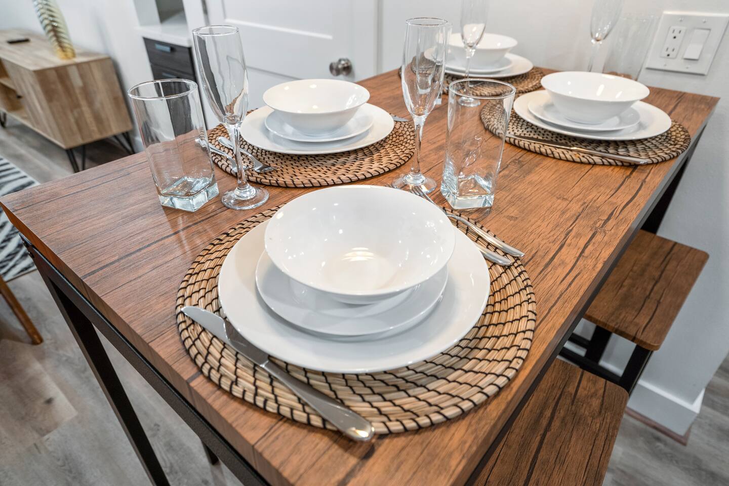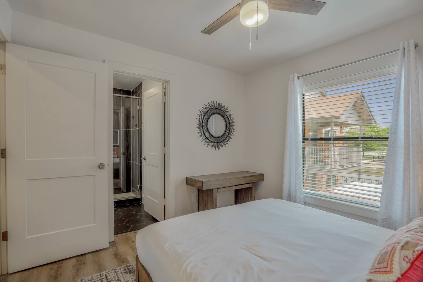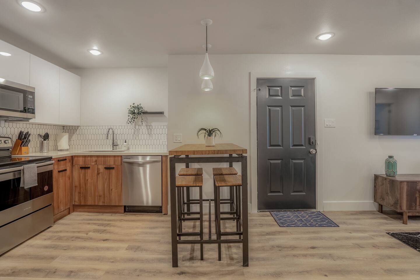 This fully renovated Ephemeral unit is located on the upper level and features 2 bedrooms and 2 bathrooms, contemporary artwork, two comfortable queen beds, and a fully equipped kitchen. You can also relax in our courtyard, which has comfortable seating including tear-drop chairs and couches. Free street parking is available around the property. This is one of 15 uniquely designed units on the property. Traveling with a larger group? We can accommodate up to 60 guests.