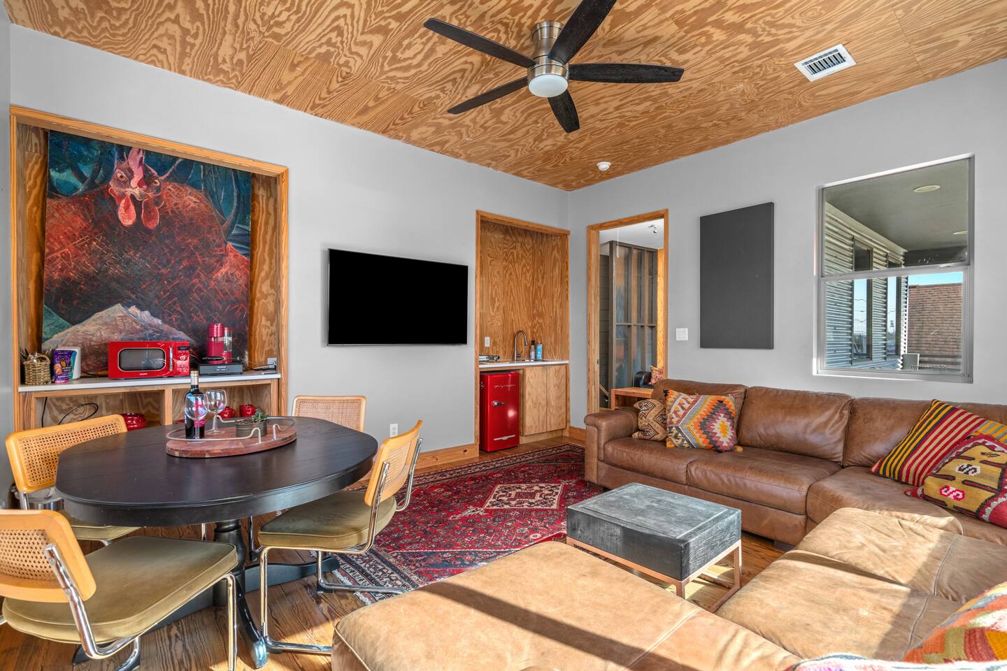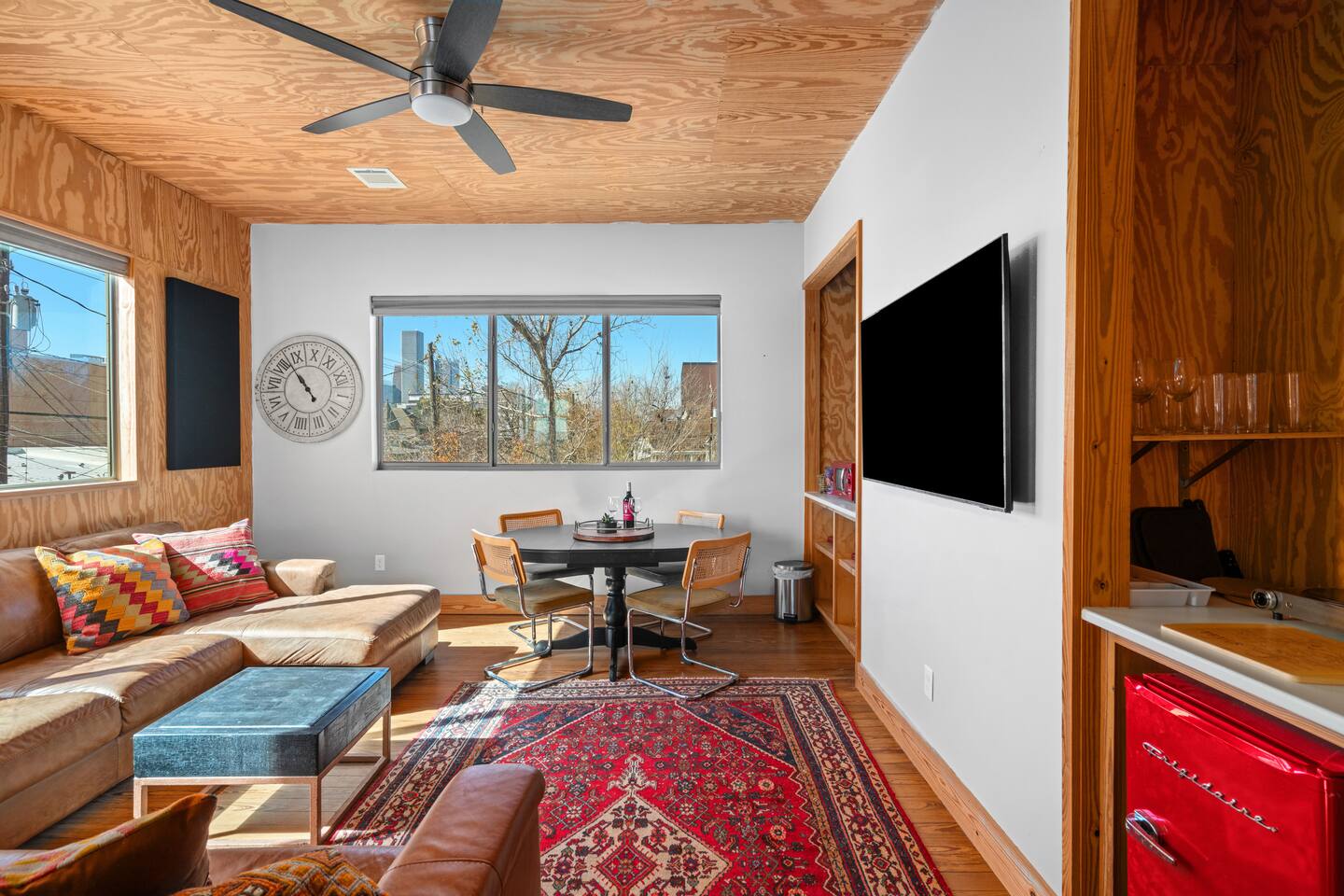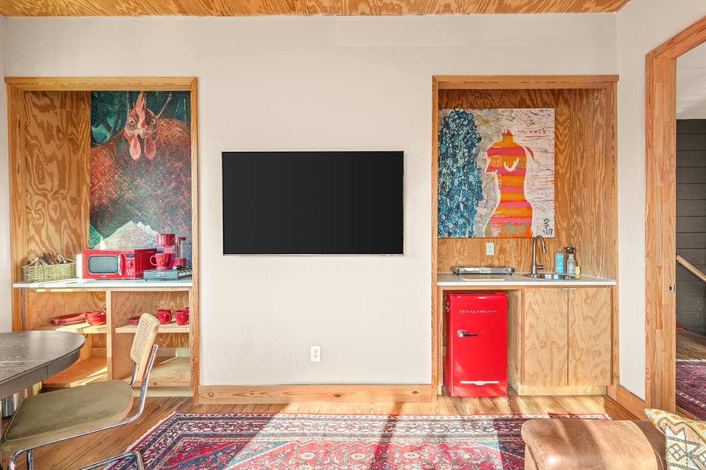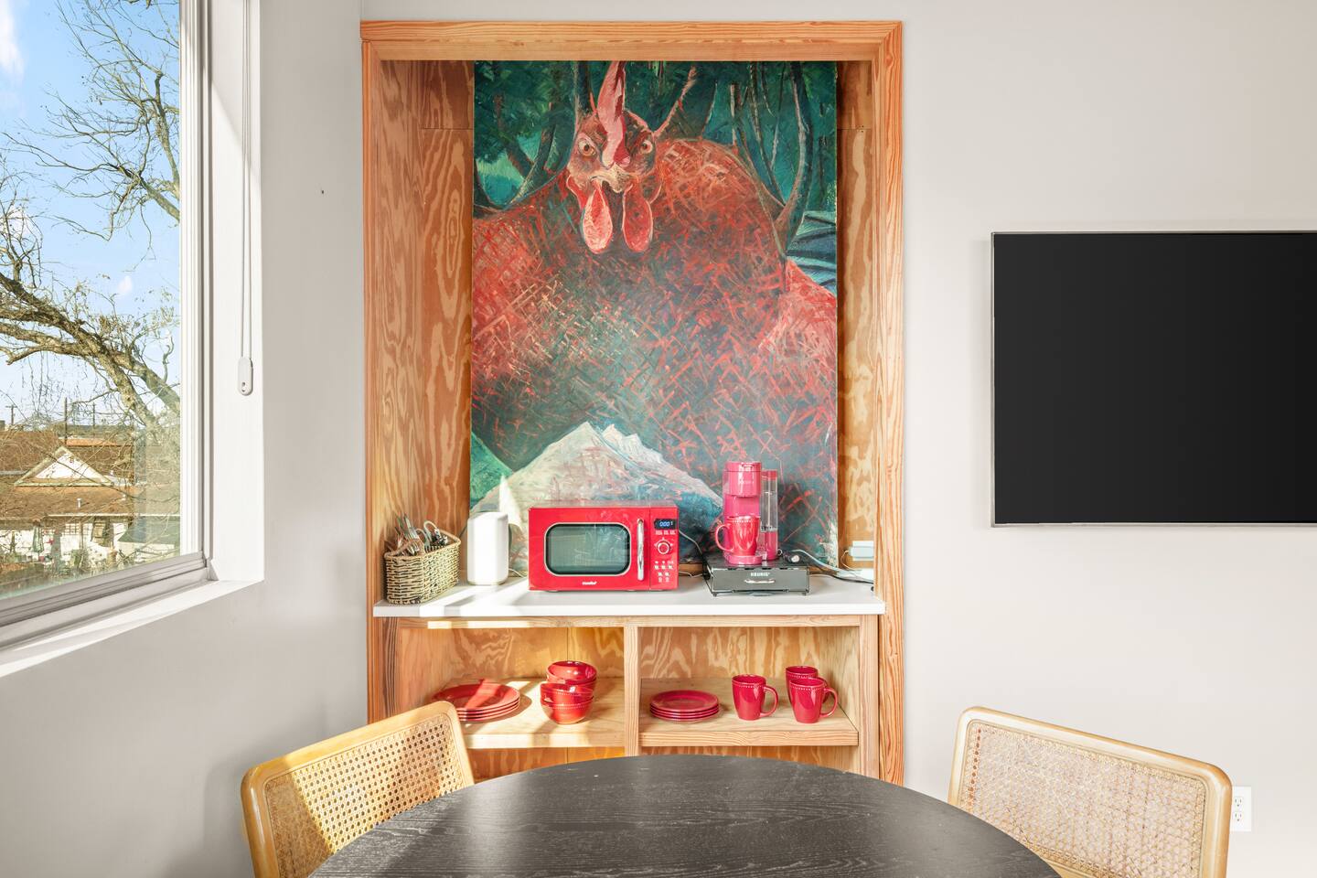 Stay in a stylish gallery-inspired loft featuring warm wood tones and curated design. The space offers 2 bedrooms with a king and queen bed, 1 bathroom, and thoughtful amenities including a mini fridge with freezer, microwave, electric heating pot, coffee machine with pods, kettle, tea, toaster, and hair dryer. On-site parking included.